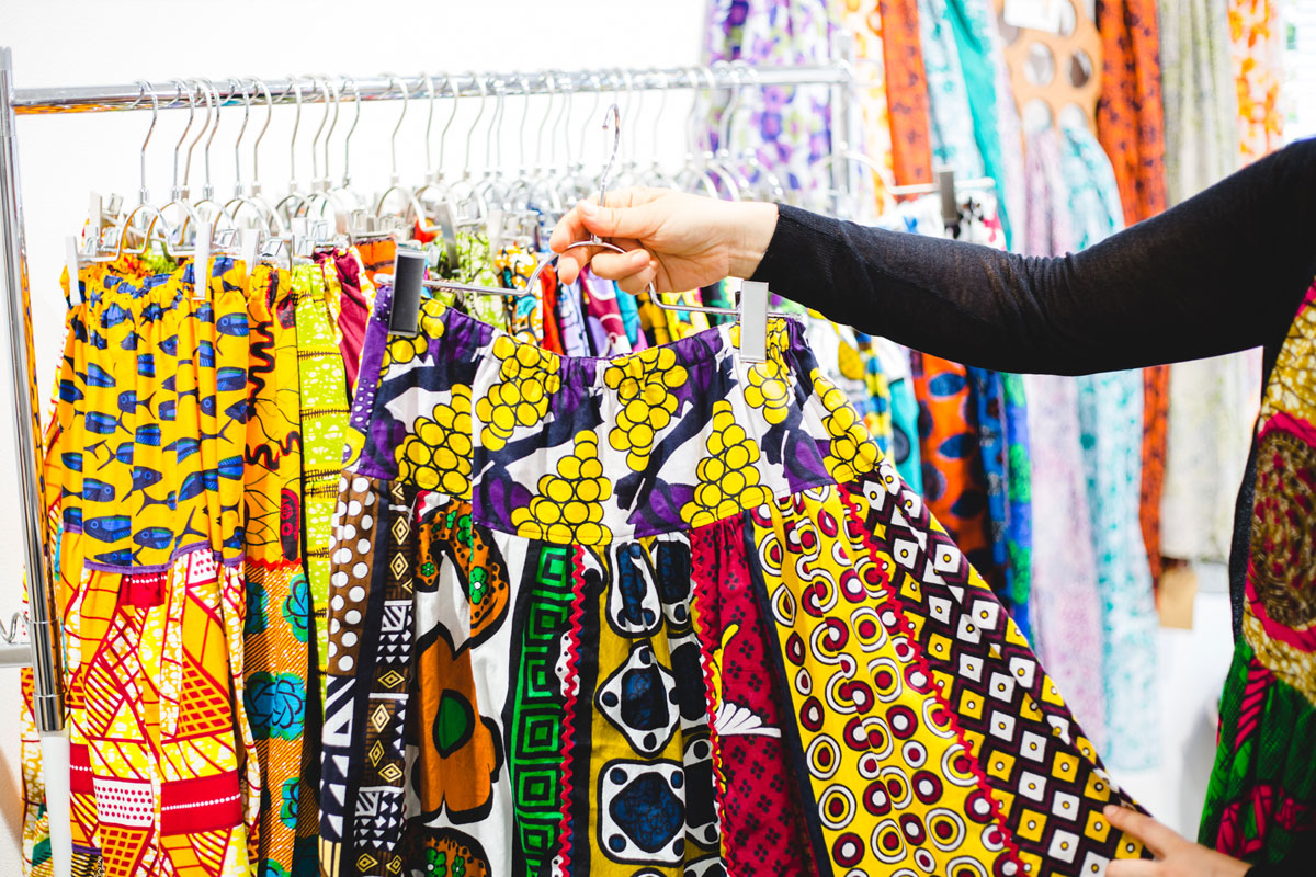 会場には「カンガのバルーンスカート」「アップサイクルのパッチワーク・コラージュバッグ」はじめ、梅田洋品店の人気作品がたっぷり並びます。