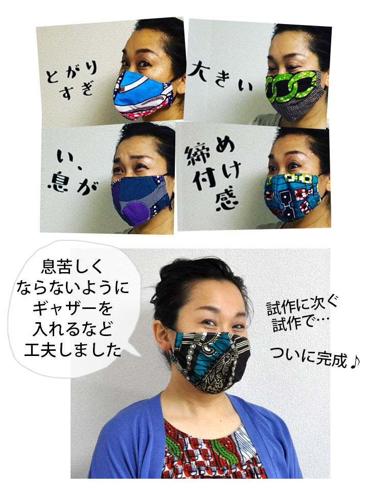柄の全体が見えるよう立体型に。また、目の詰まった素材のため、息苦しくならないようにギャザーを入れるなど工夫しました。