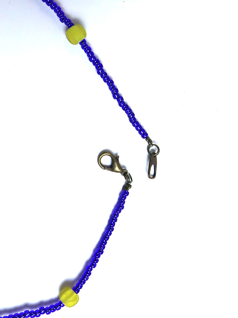 素材:再生ガラスビーズ(ガーナ産)、ガラスビーズ(国産)、真鍮、ステンレスワイヤー