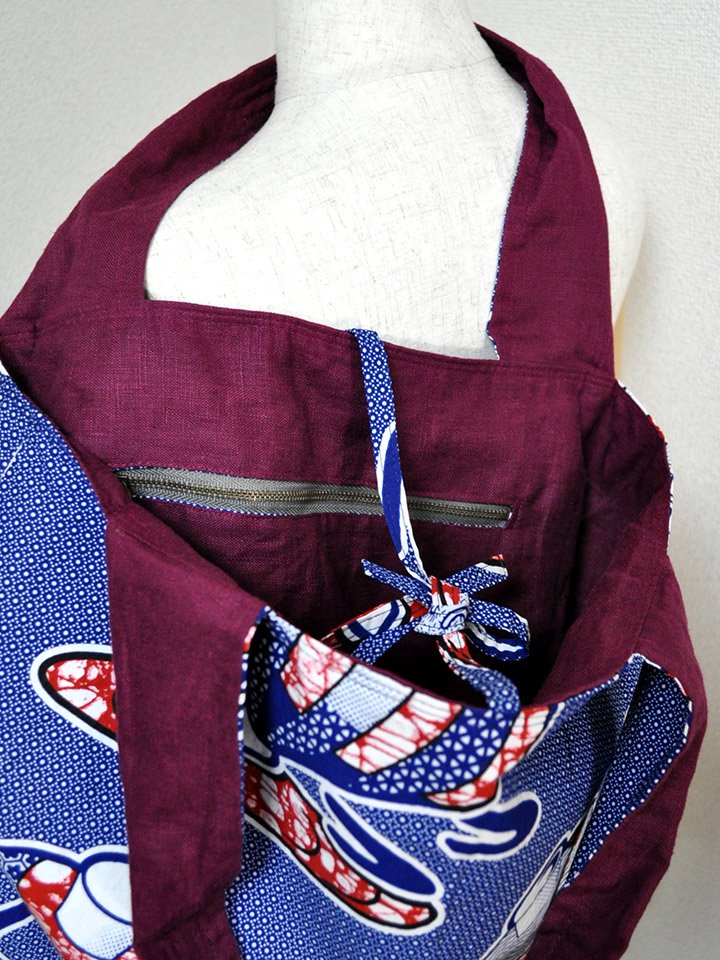 リネンのリバーシブルバッグ・ブルー×赤いコマ(リネン色ボルドー)