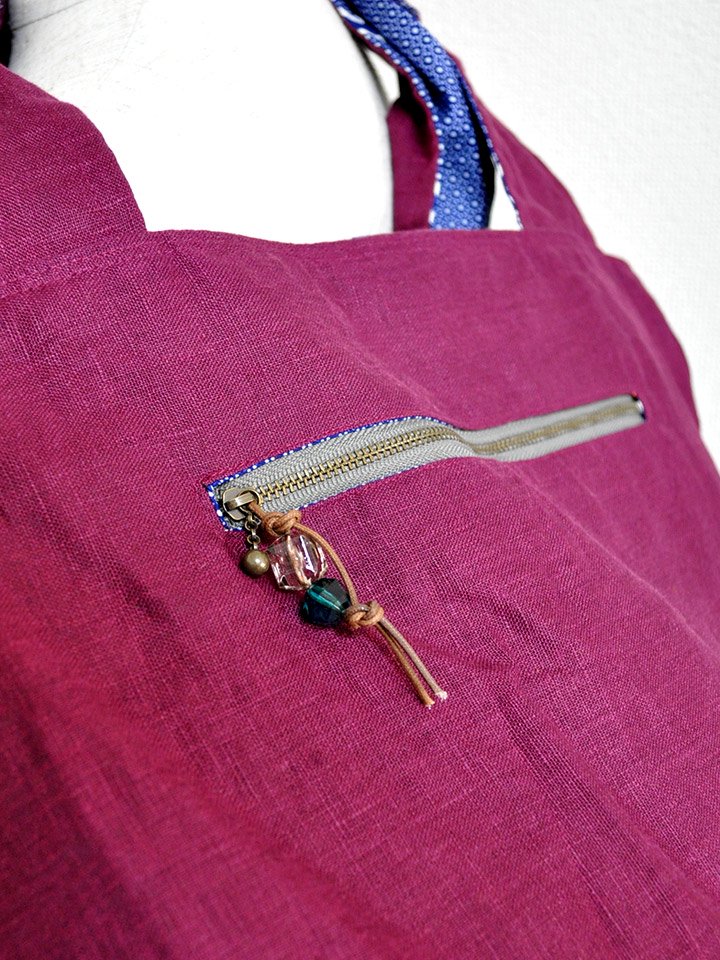 リネン側のポケットにはファスナーがあり、ファスナーの先にはボタンをつけました。
