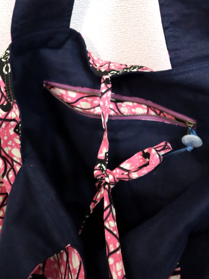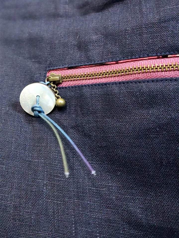 リネン側のポケットにはファスナーがあり、ファスナーの先にはボタンをつけました。