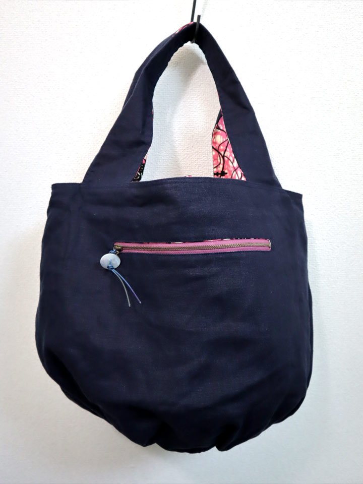 リネンのリバーシブルバッグ・ピンク×コークスクリュー(リネン色ネイビー)