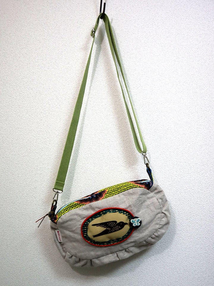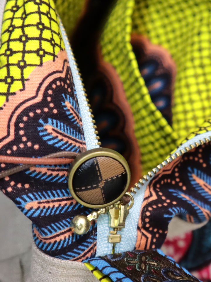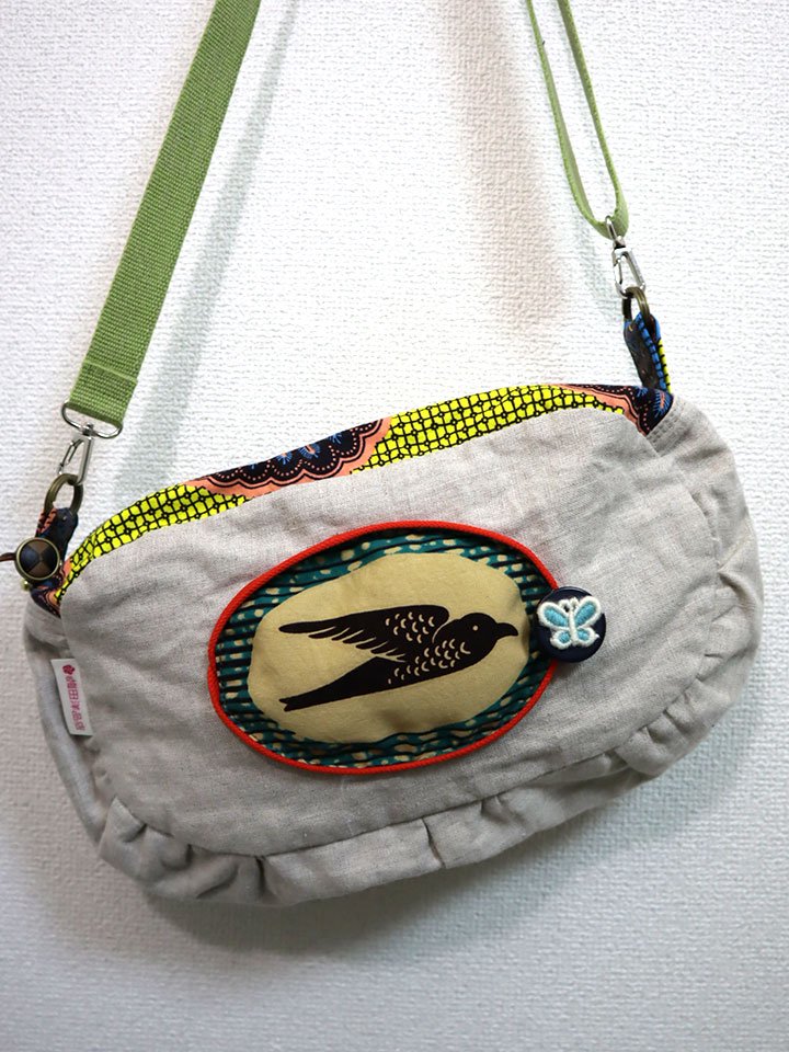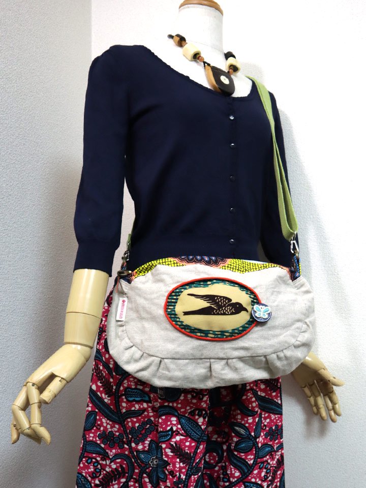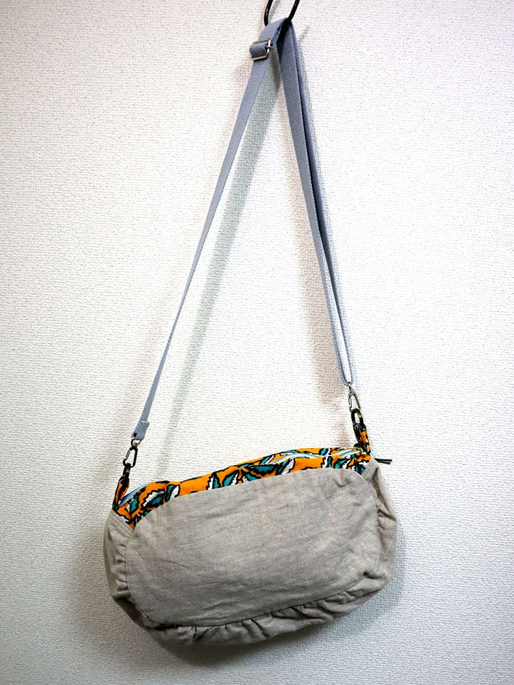 表地にリネン、ファスナー横の布と裏地にアフリカンプリントを使った斜め掛けバッグです。