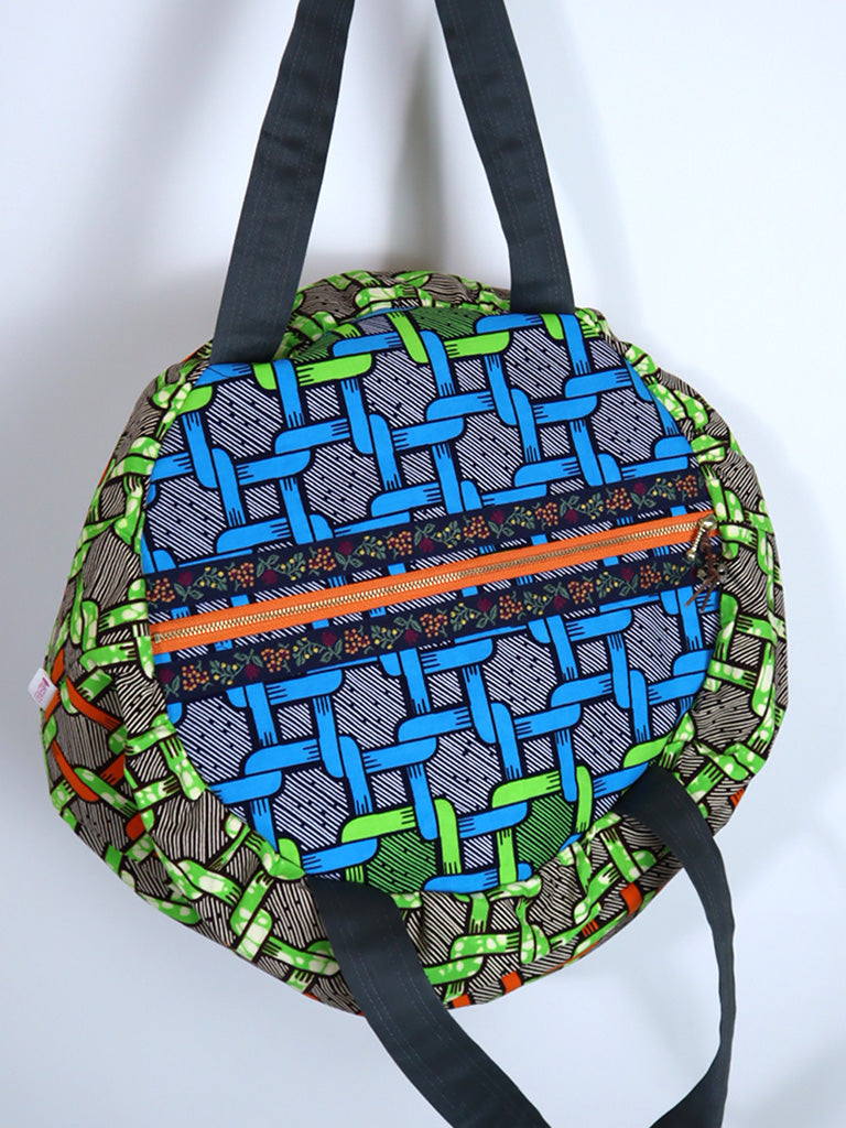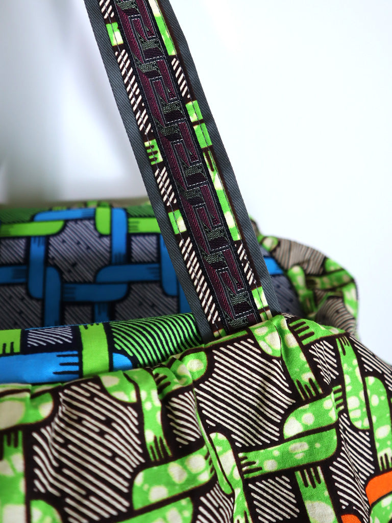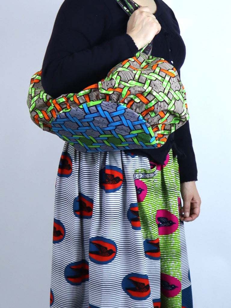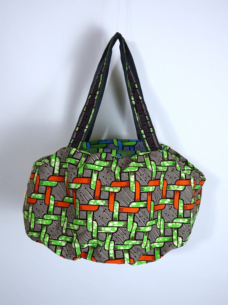 【サイズ】ファスナー口 30cm/ H 28cm / W 30cm + ギャザー分約10cm / もち手 53cm / 裏ポケット H 18cm、W 18cm