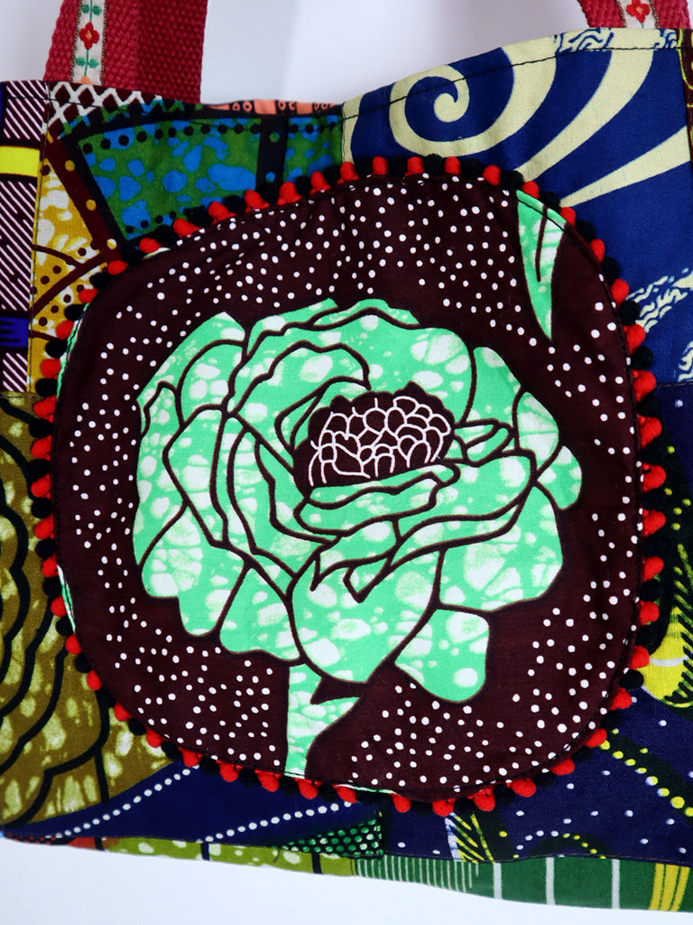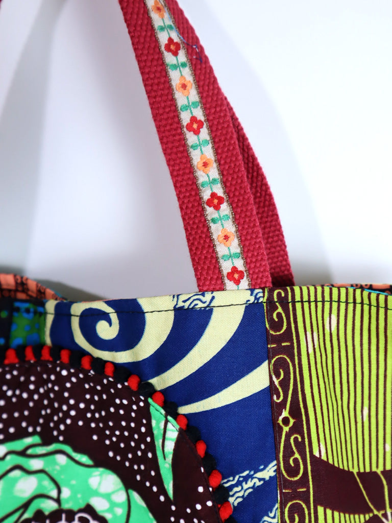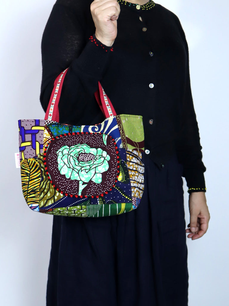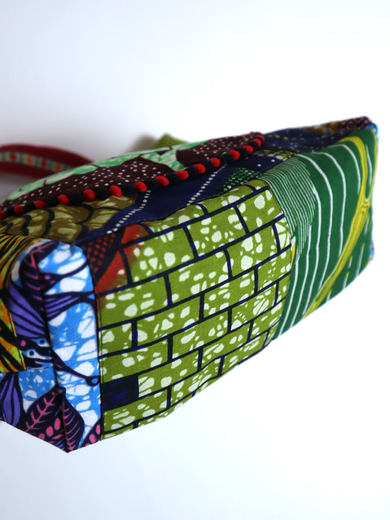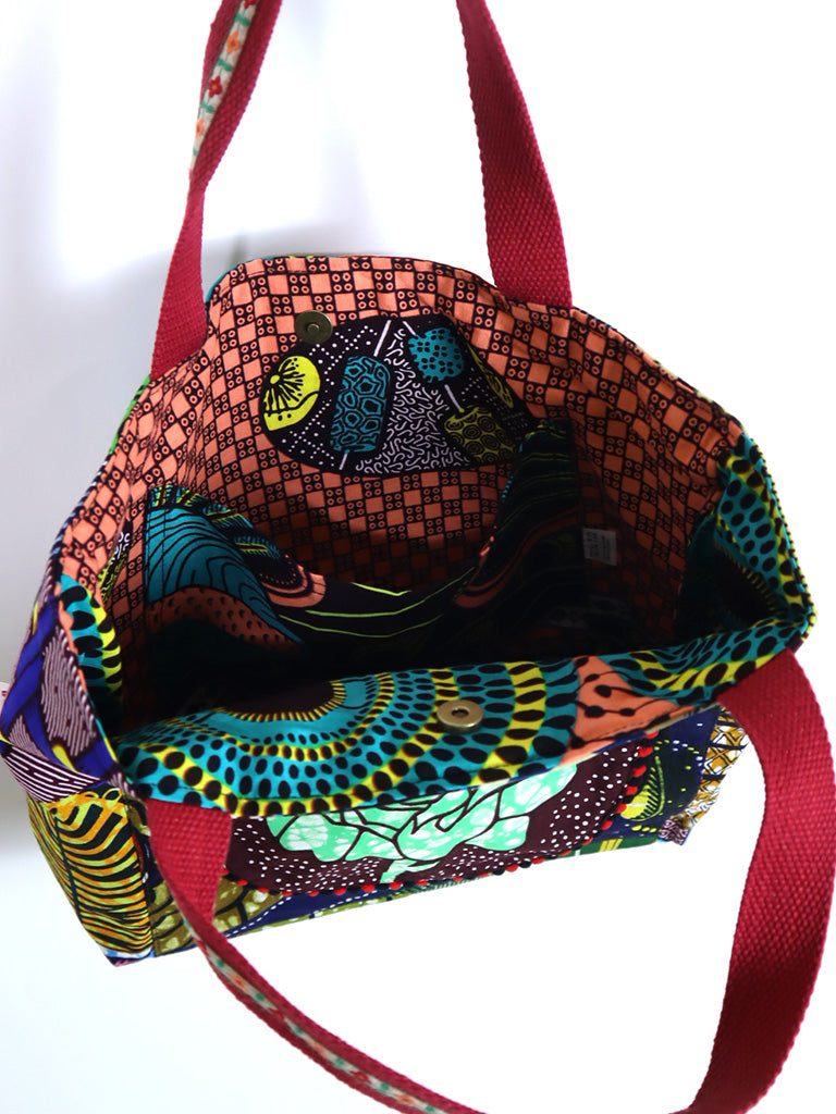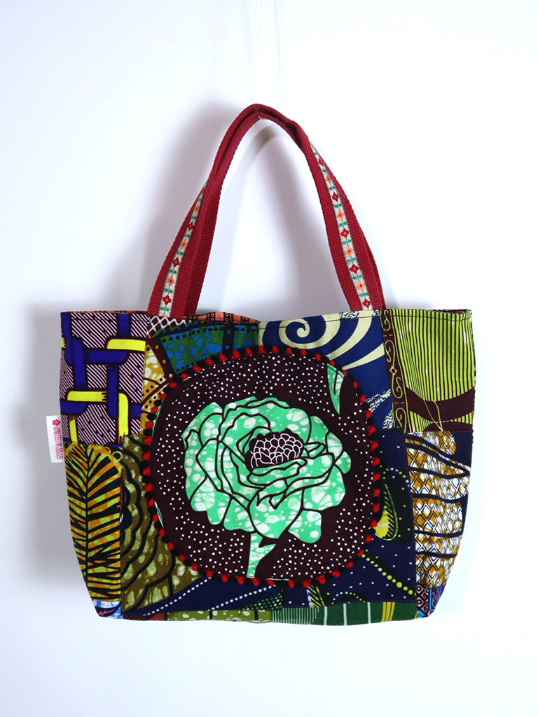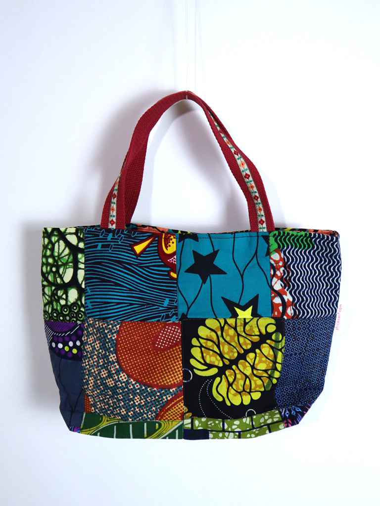 西アフリカのプリント布を使った、持ち運びが楽しくなる「アップサイクル」のバッグです。