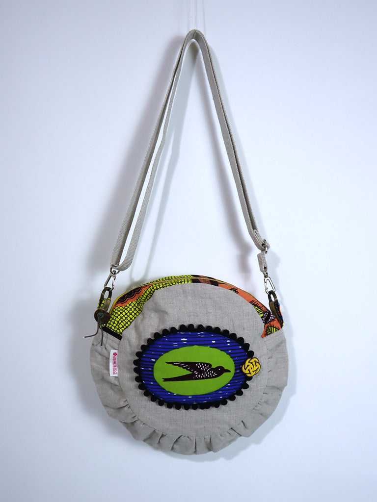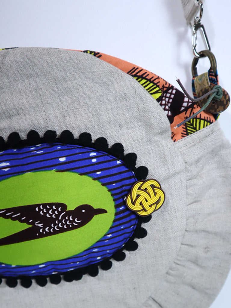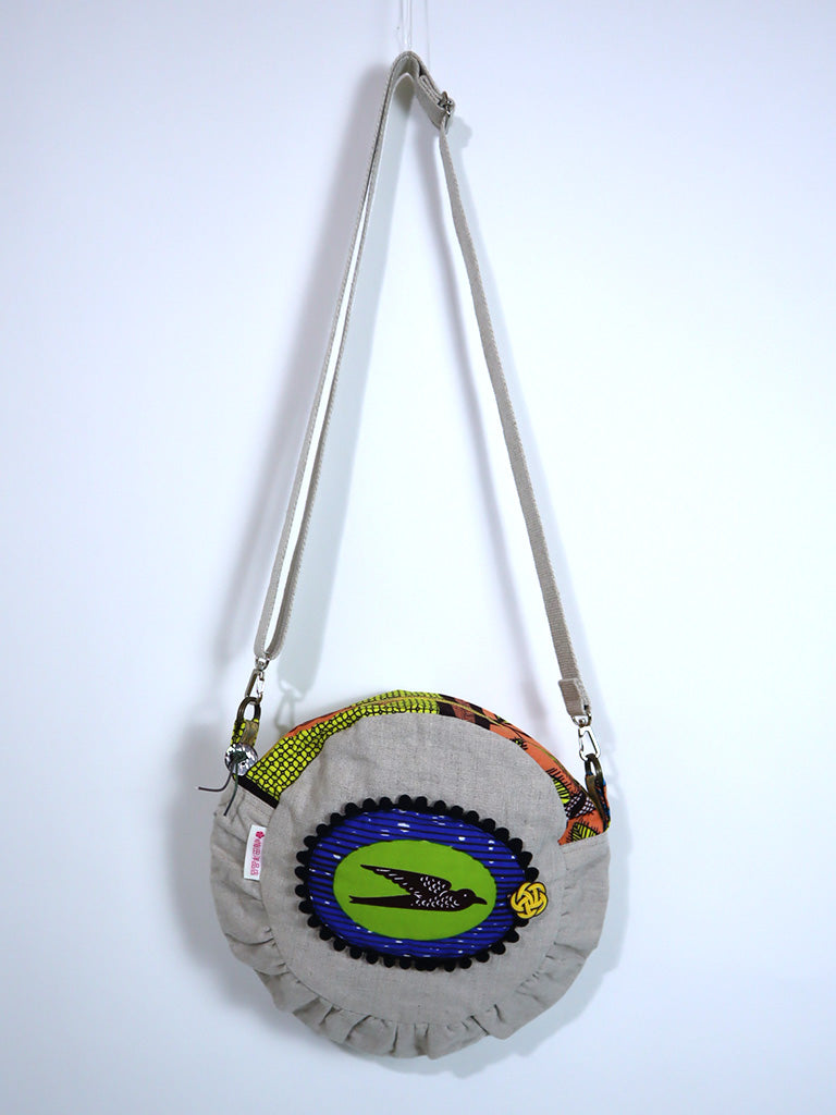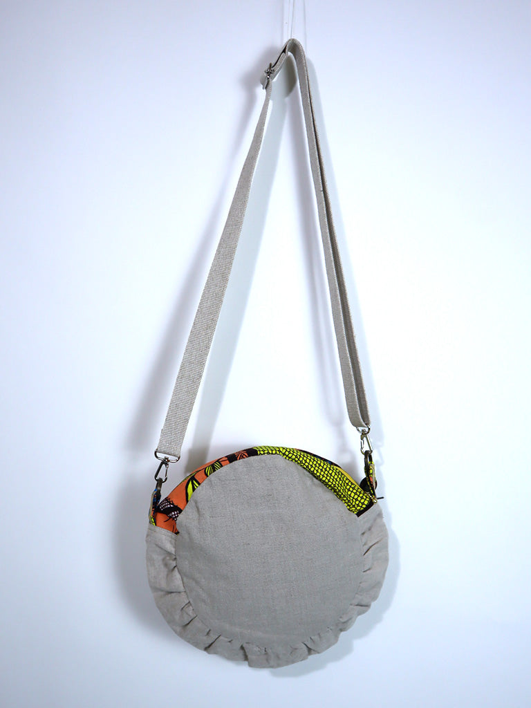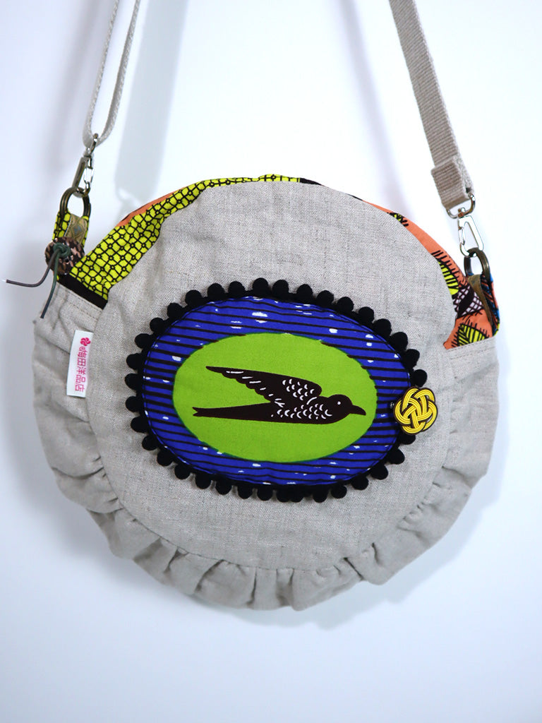 表地にリネン、ファスナー横の布と裏地にアフリカンプリントを使った丸形の斜め掛けバッグです。