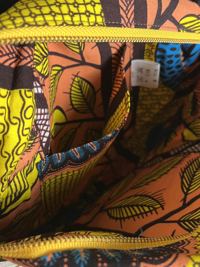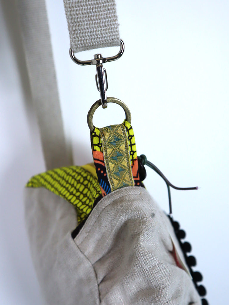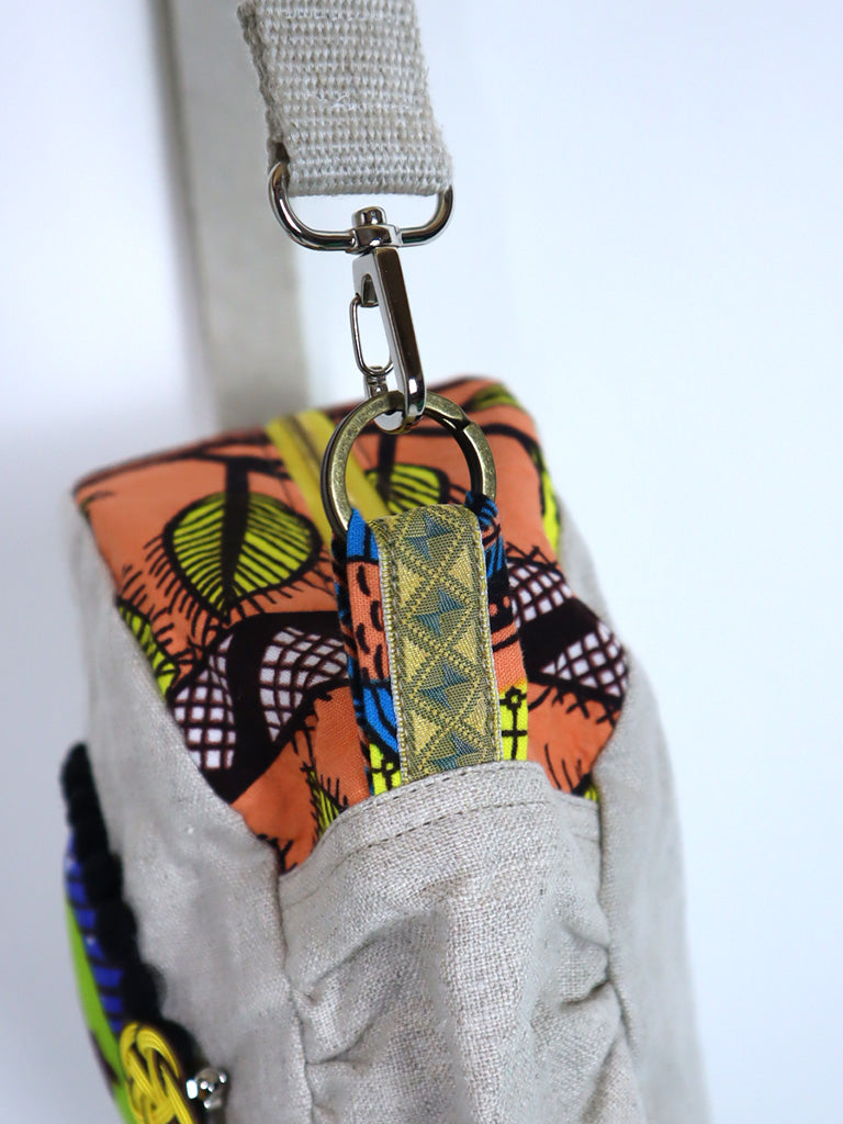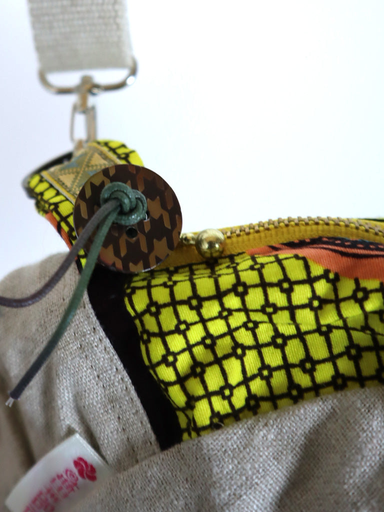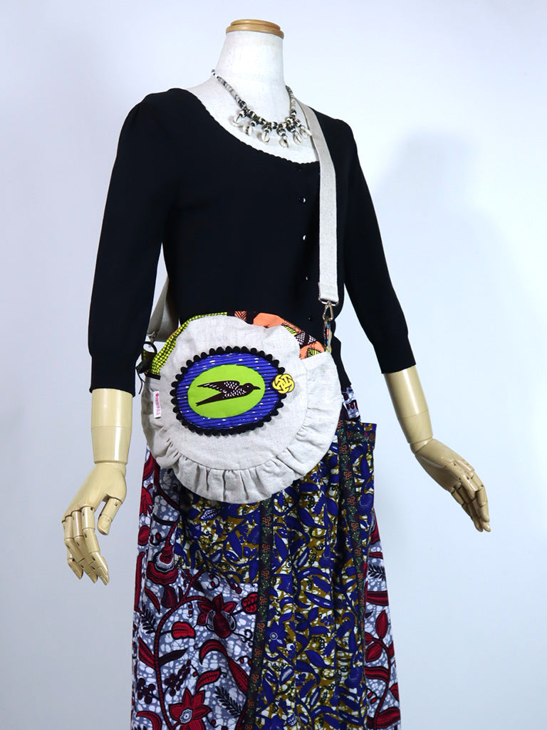 表地にリネン、ファスナー横の布と裏地にアフリカンプリントを使った丸形の斜め掛けバッグです。