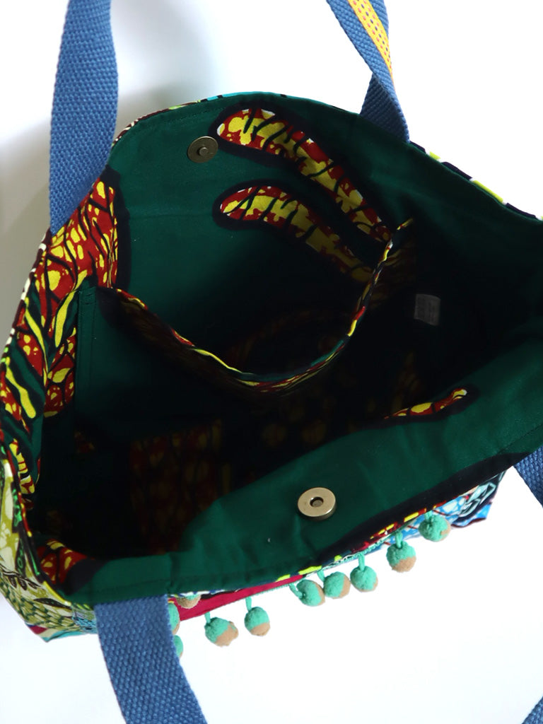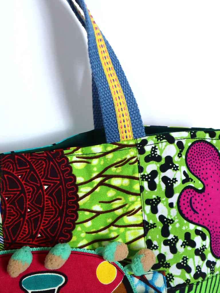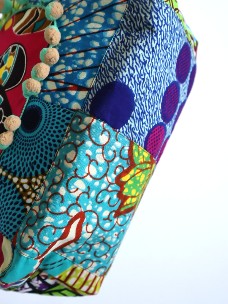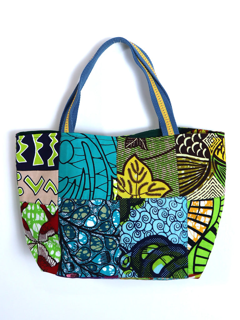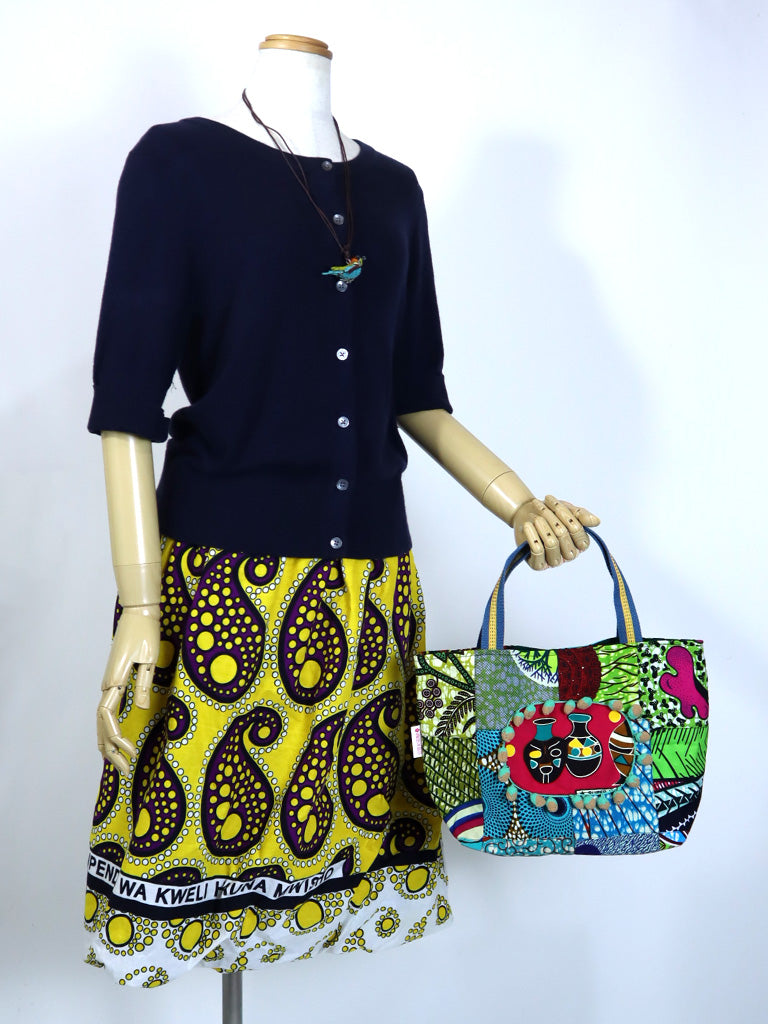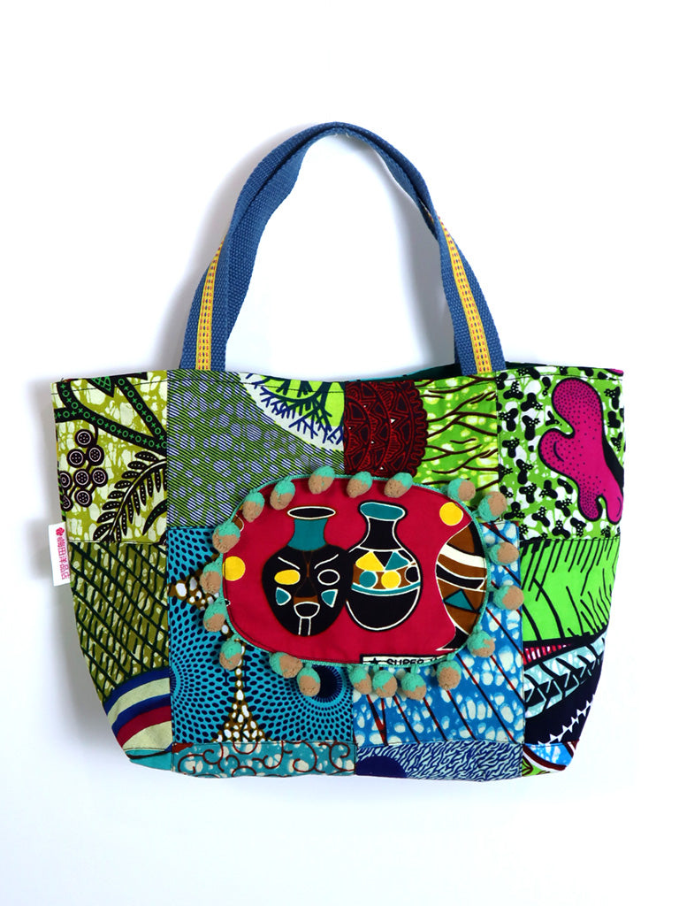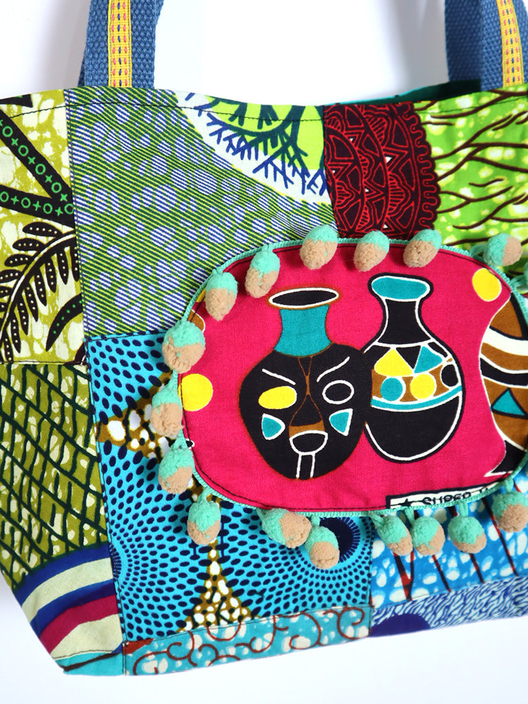 西アフリカのプリント布を使った、持ち運びが楽しくなる「アップサイクル」のバッグです。