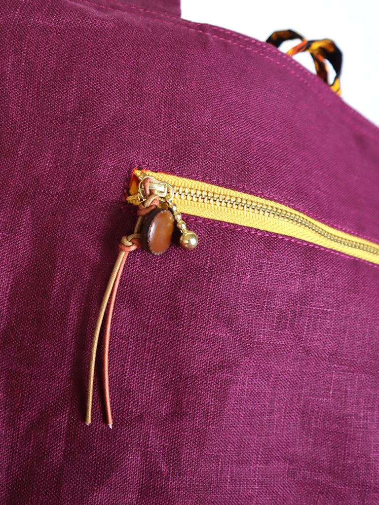 リネン側のポケットにはファスナーがあり、ファスナーの先にはボタンをつけました。