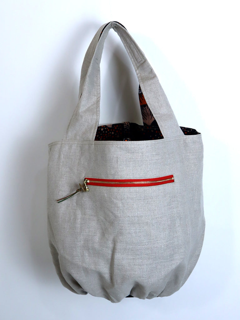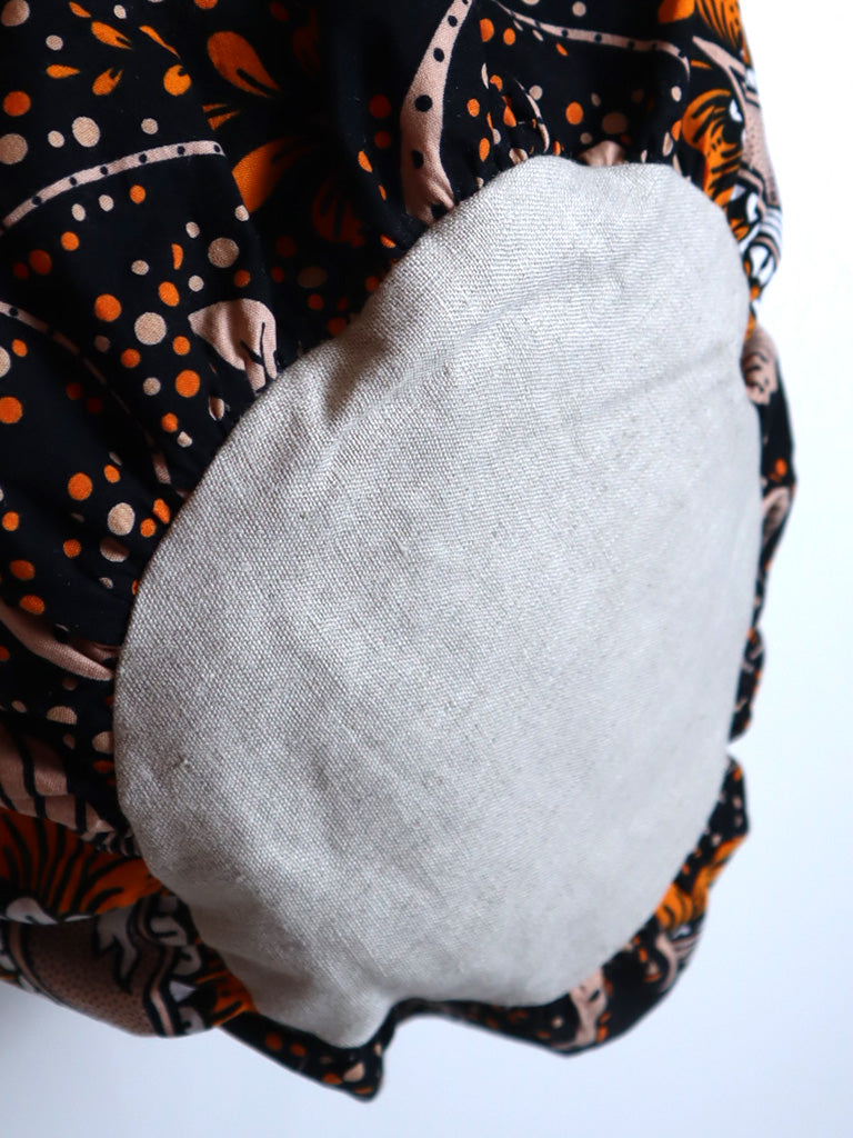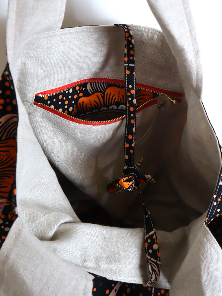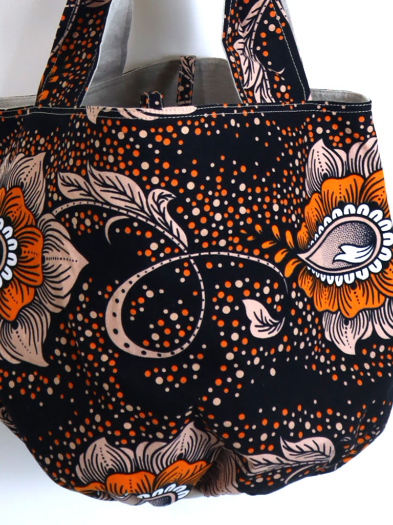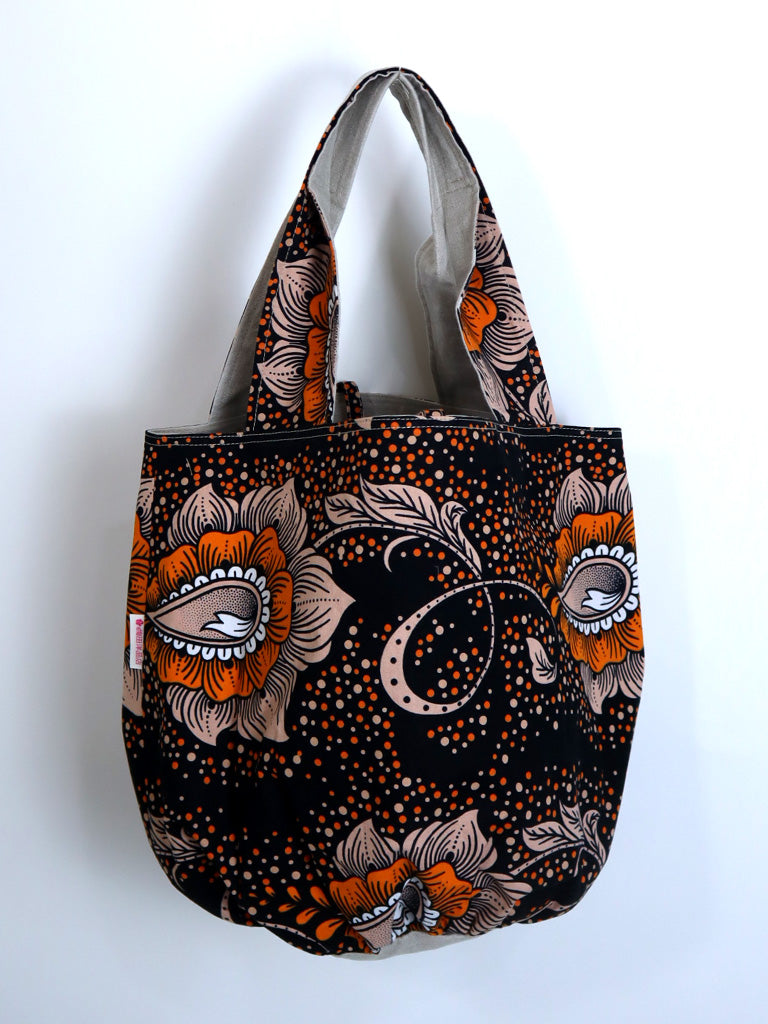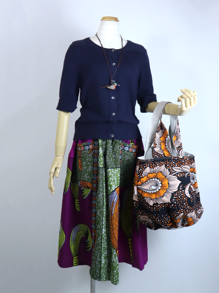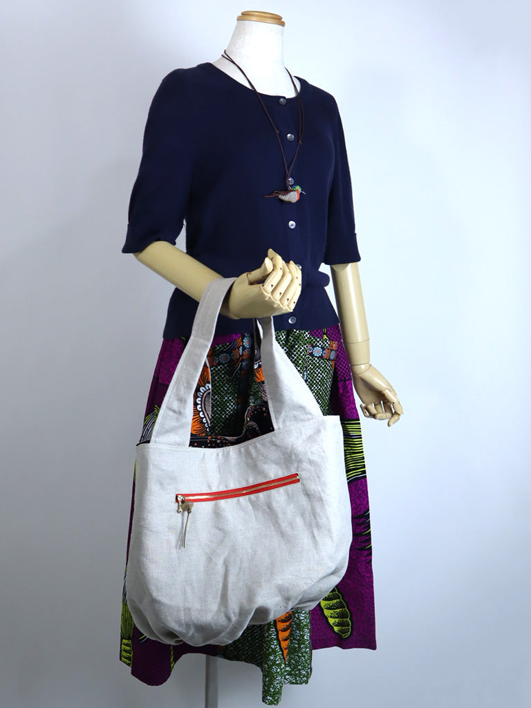 たとえば、服が柄物のときはバッグをリネンの側に裏返し、服がモノトーンのときはバッグはアフリカンプリントに。