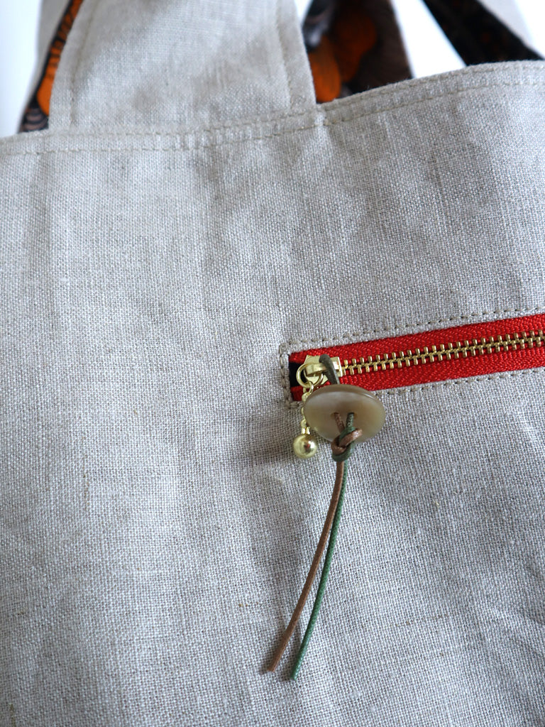 リネン側のポケットにはファスナーがあり、ファスナーの先にはボタンをつけました。