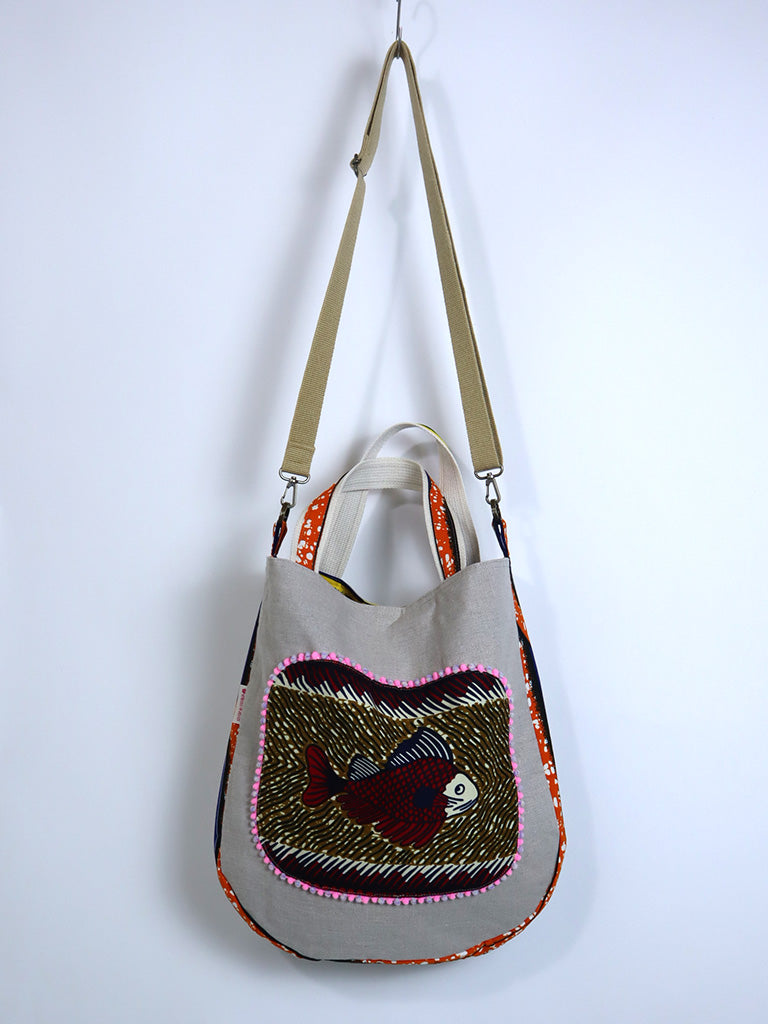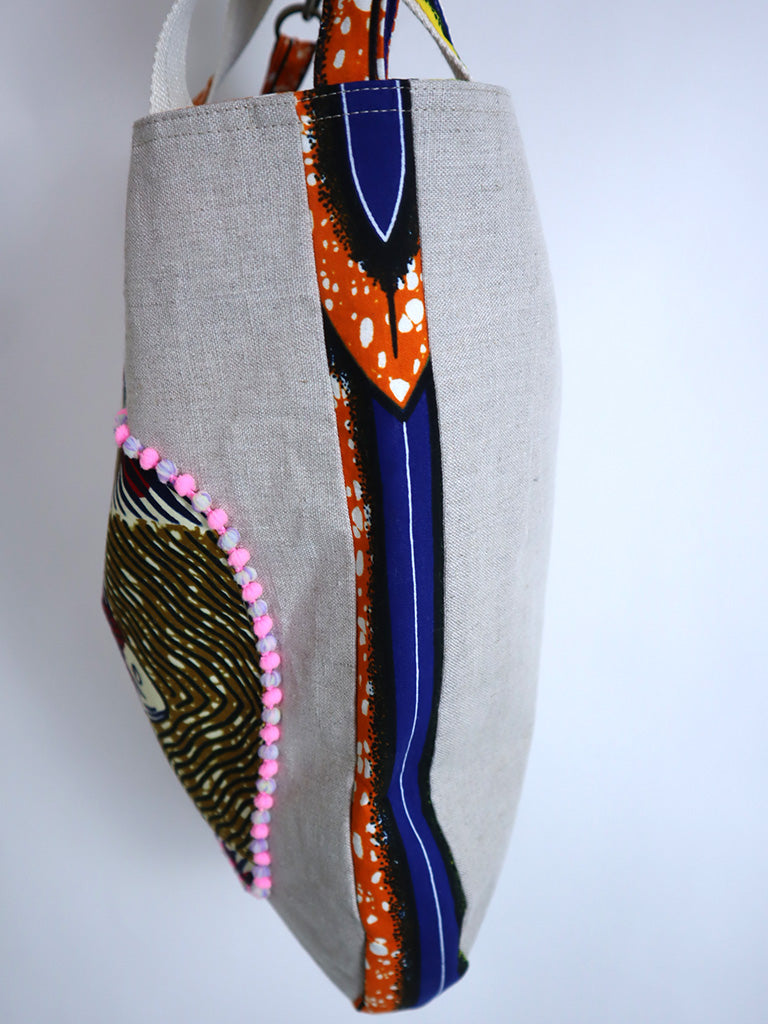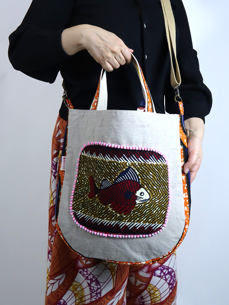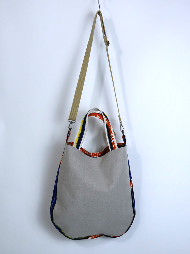 リネンを表地に、アフリカンプリントをサイドと裏地に使用したバッグです。手持ちはもちろん、ストラップで肩掛け・斜め掛けができる2way仕様です。