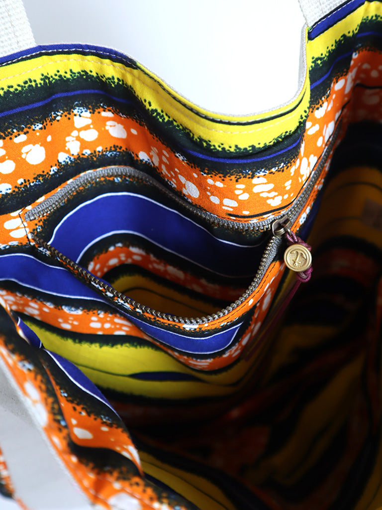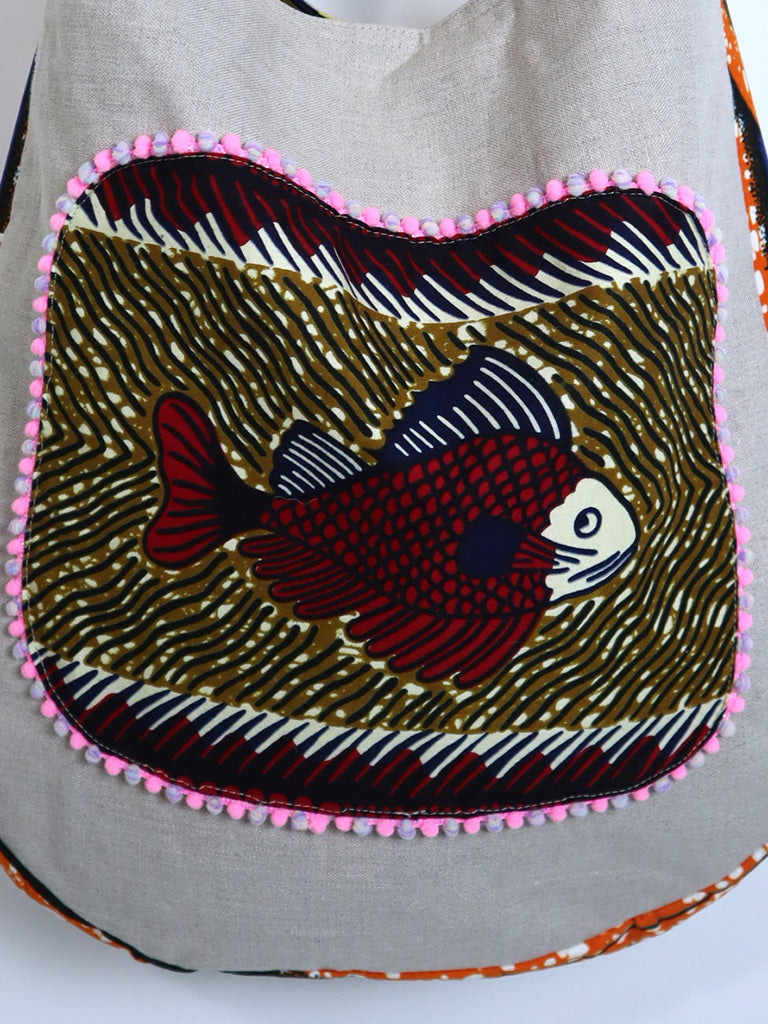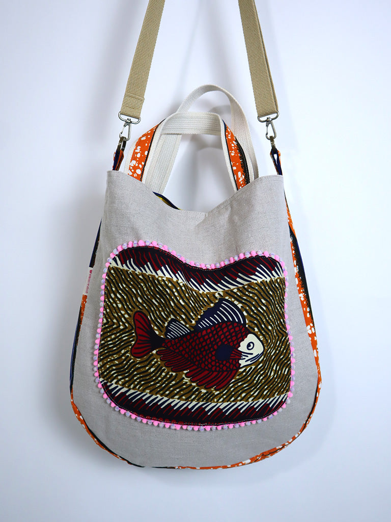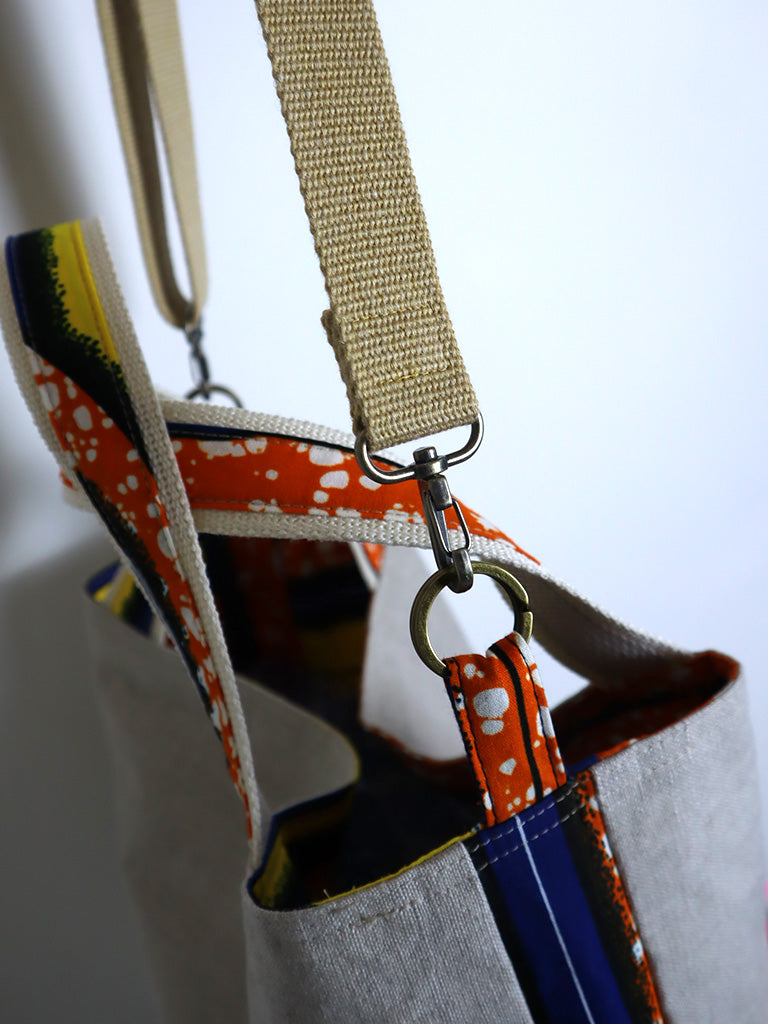 リネンを表地に、アフリカンプリントをサイドと裏地に使用したバッグです。手持ちはもちろん、ストラップで肩掛け・斜め掛けができる2way仕様です。