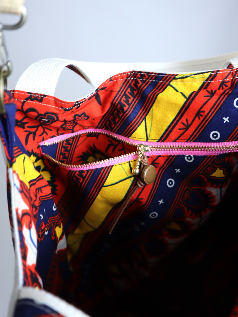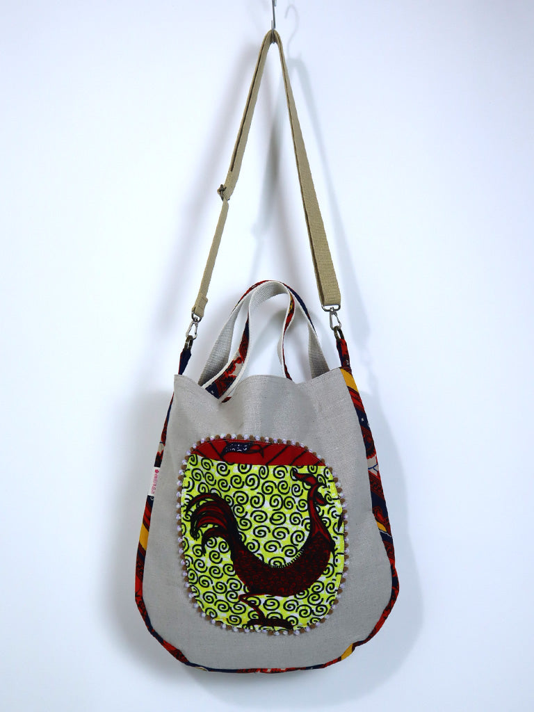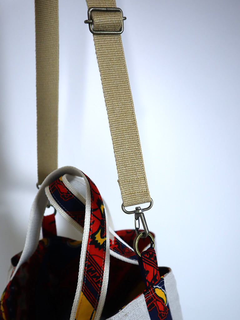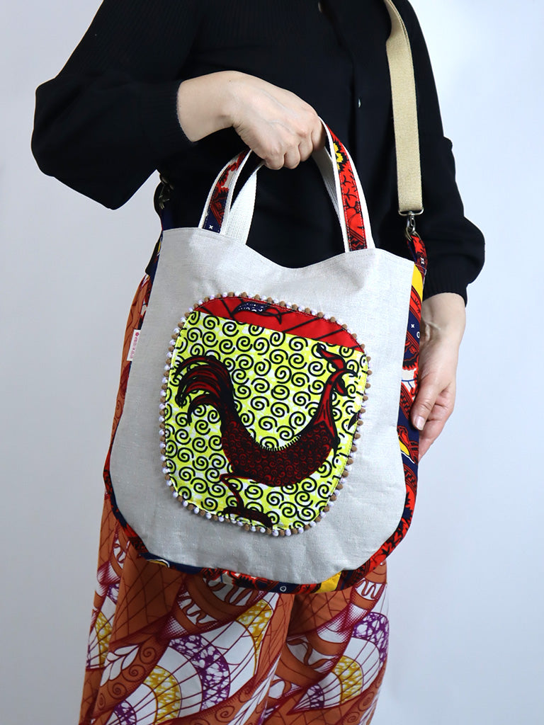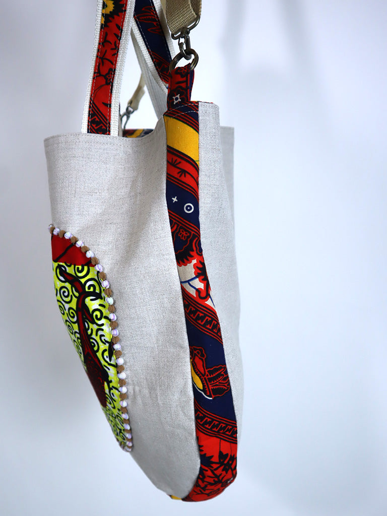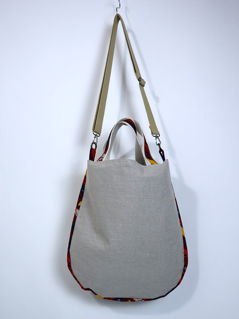 リネンを表地に、アフリカンプリントをサイドと裏地に使用したバッグです。手持ちはもちろん、ストラップで肩掛け・斜め掛けができる2way仕様です。