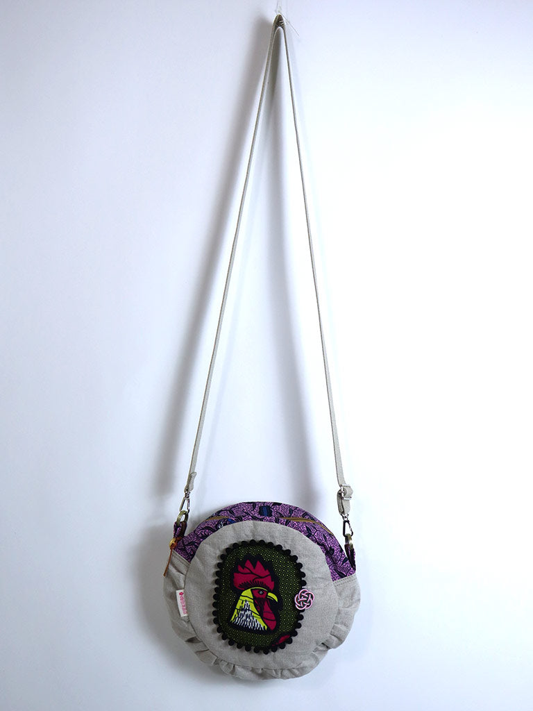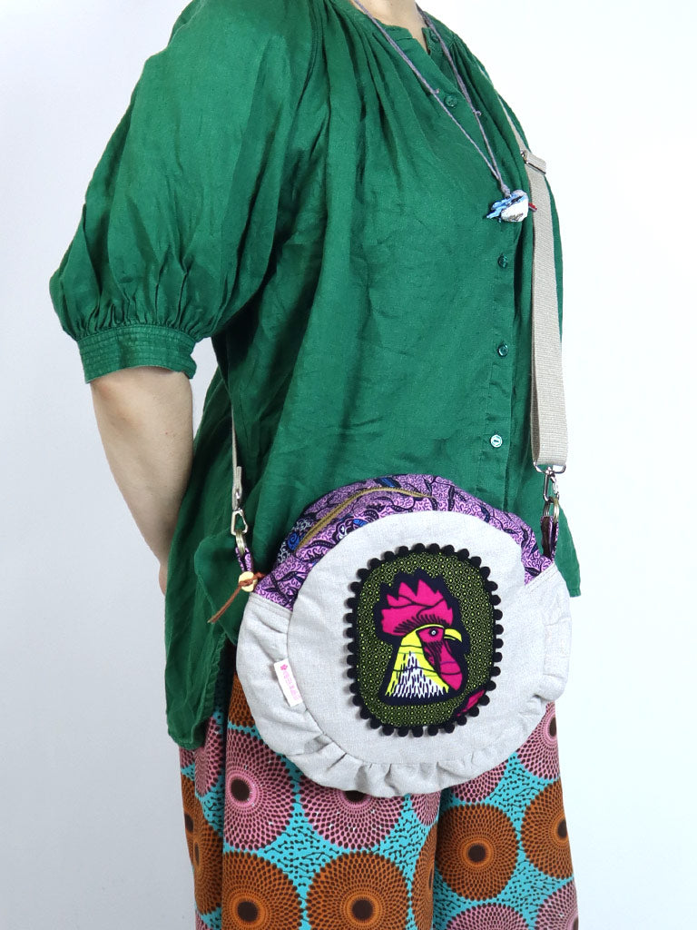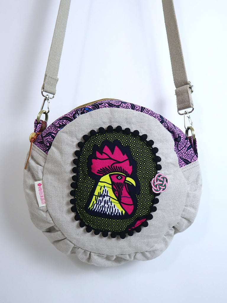 リネンのコラージュ・ショルダー・サークルバッグ・にわとり
