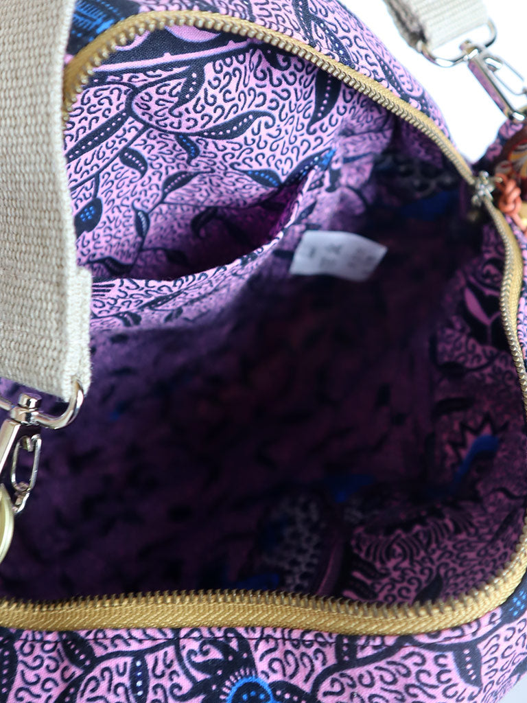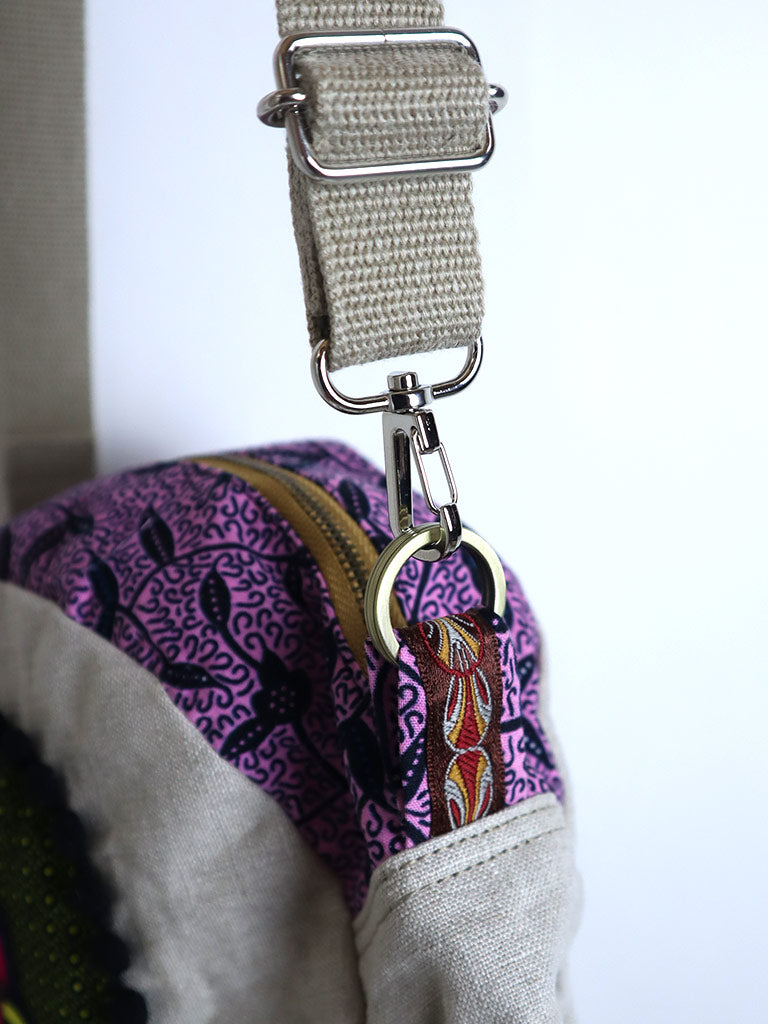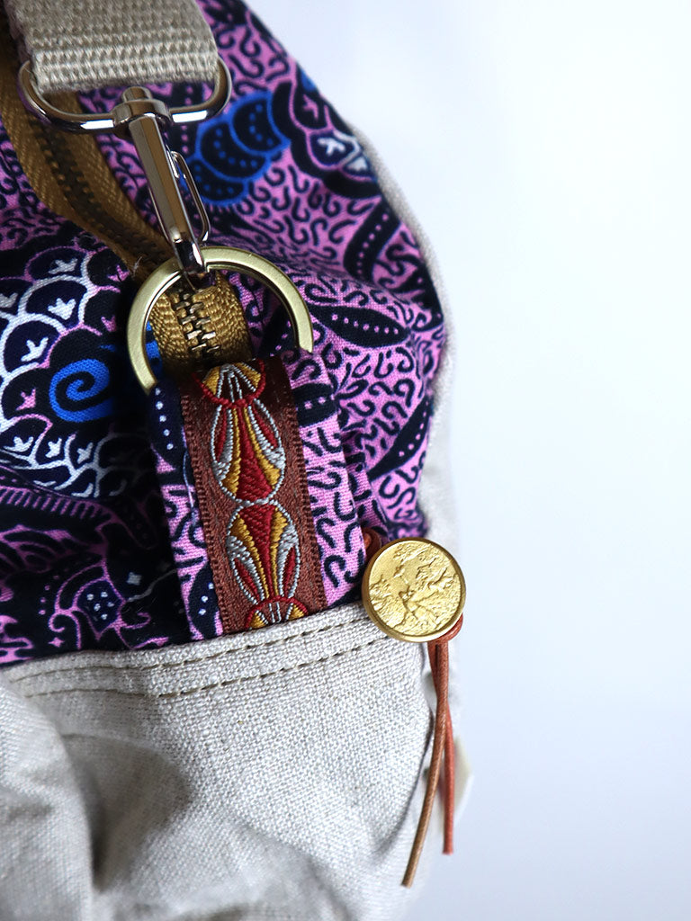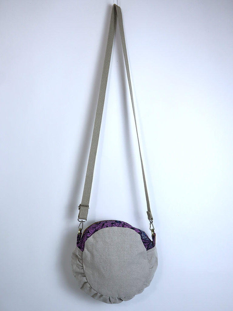 表地にリネン、ファスナー横の布と裏地にアフリカンプリントを使った丸形の斜め掛けバッグです。