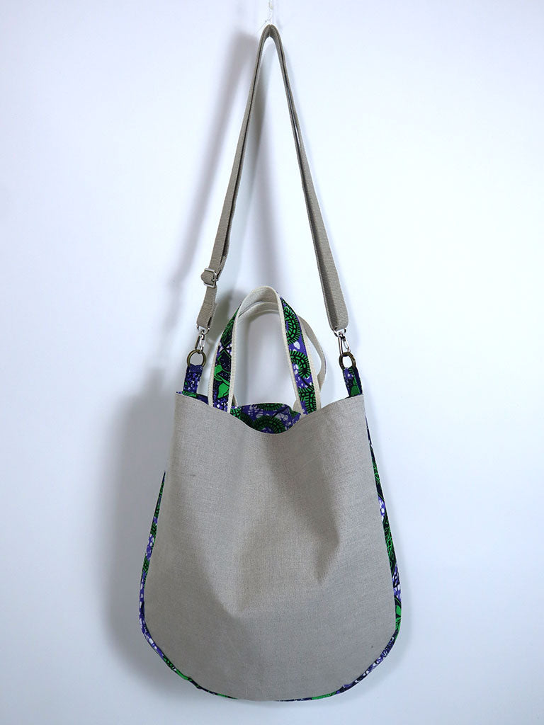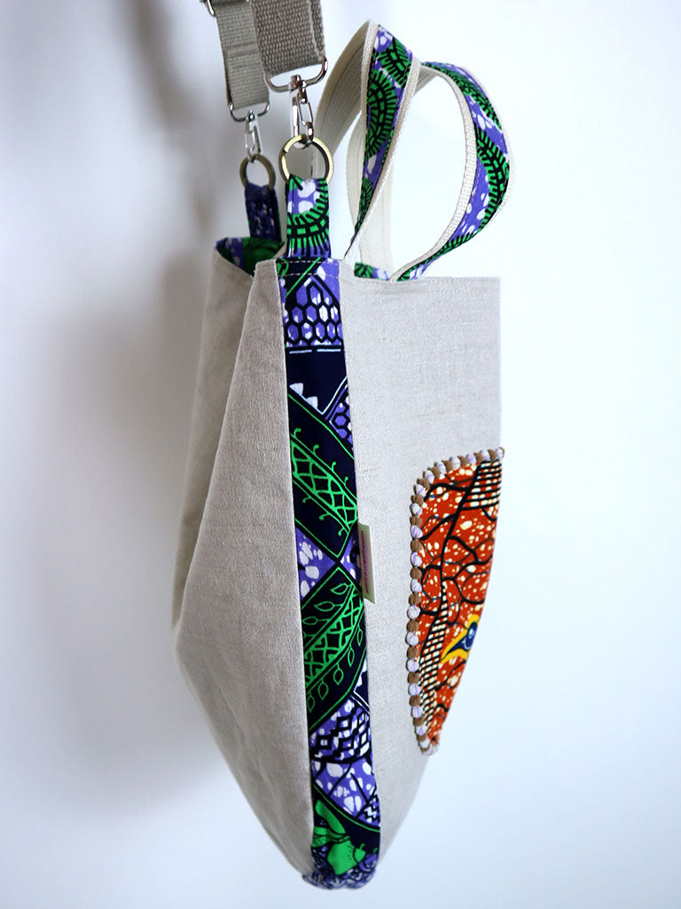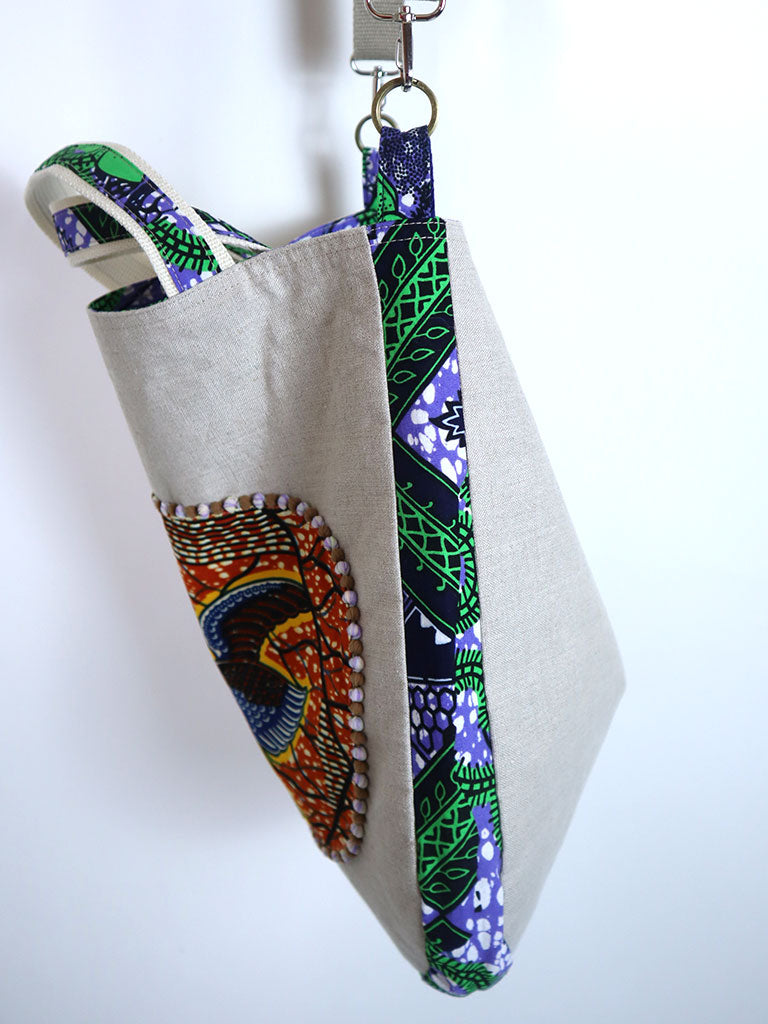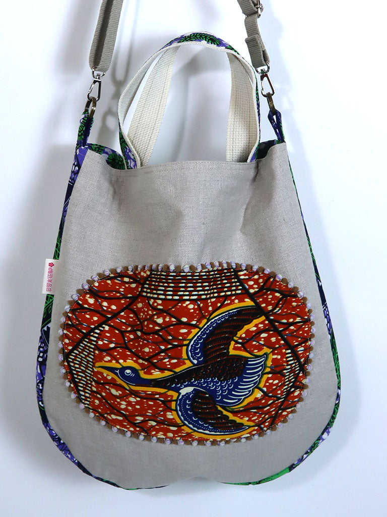 リネンを表地に、アフリカンプリントをサイドと裏地に使用したバッグです。手持ちはもちろん、ストラップで肩掛け・斜め掛けができる2way仕様です。