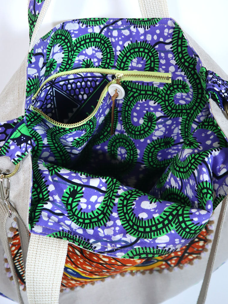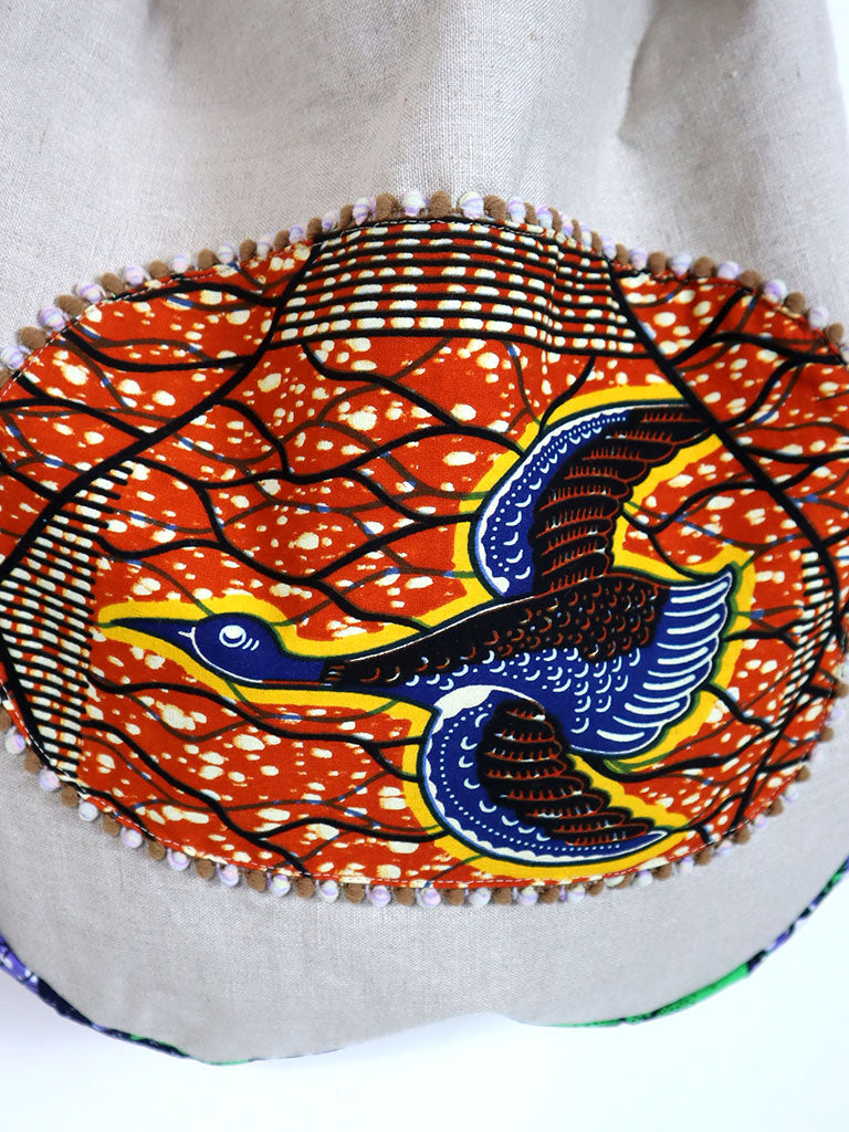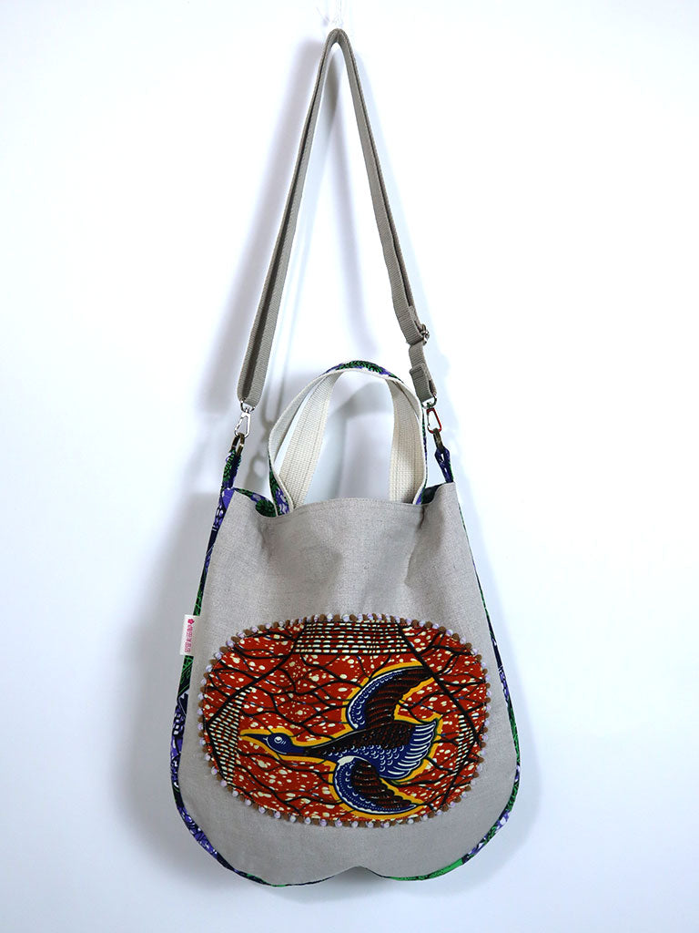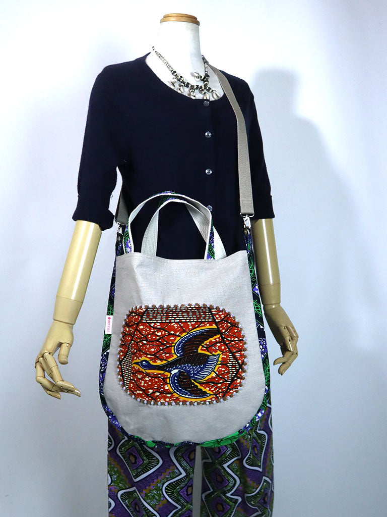 リネンを表地に、アフリカンプリントをサイドと裏地に使用したバッグです。手持ちはもちろん、ストラップで肩掛け・斜め掛けができる2way仕様です。