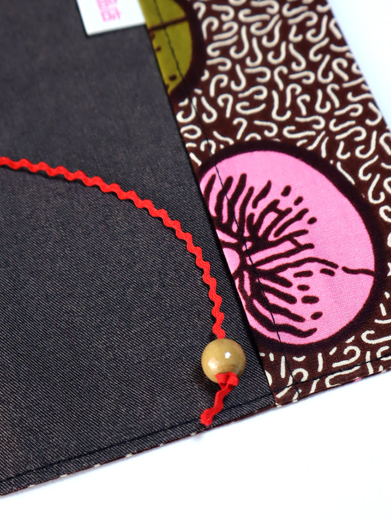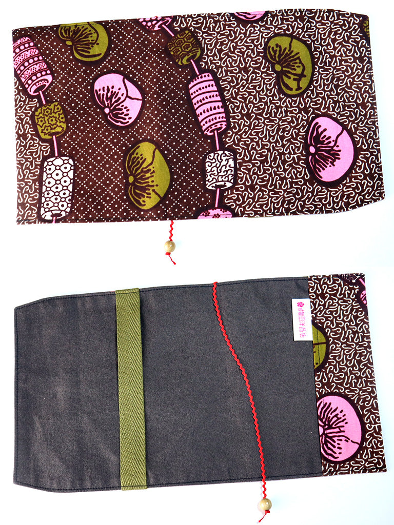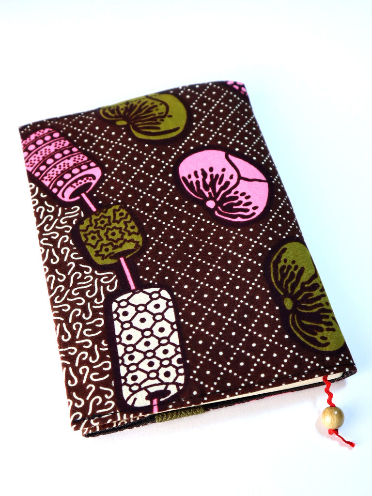 【文庫用】アフリカンプリントのブックカバー・ブラウン×ピンクビーズ