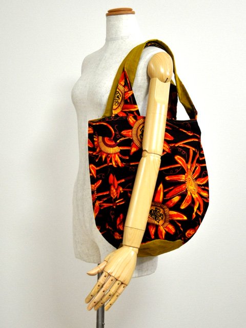 リネンのリバーシブルバッグ・ダークブラウン×オレンジサンフラワー(リネン色マスタード)