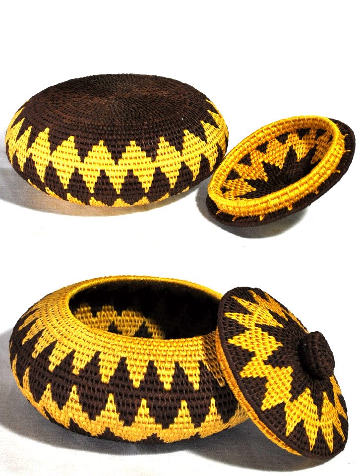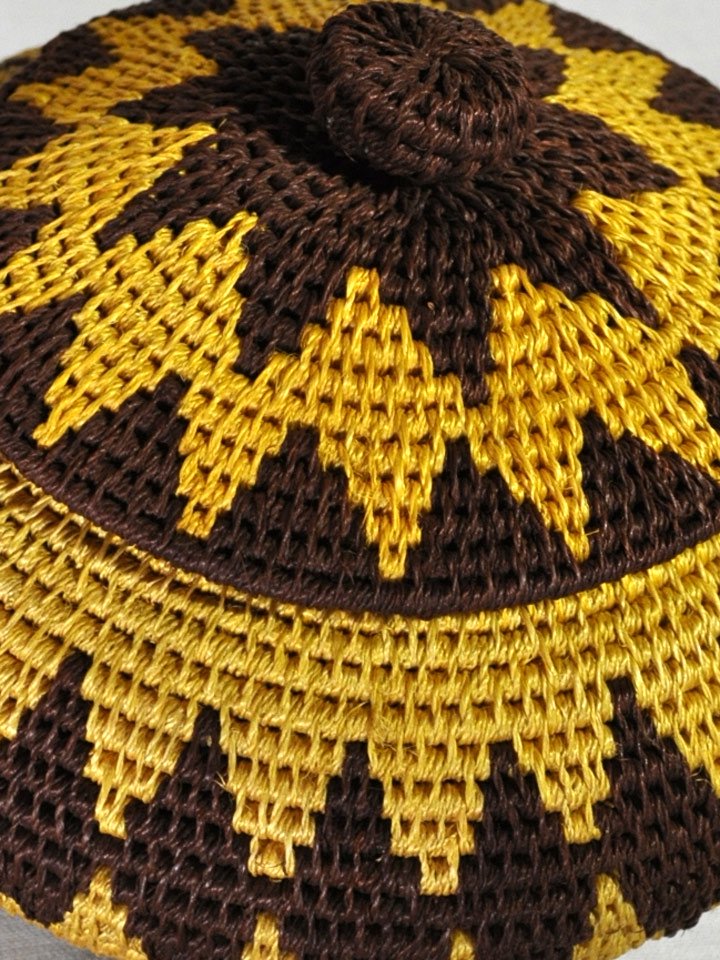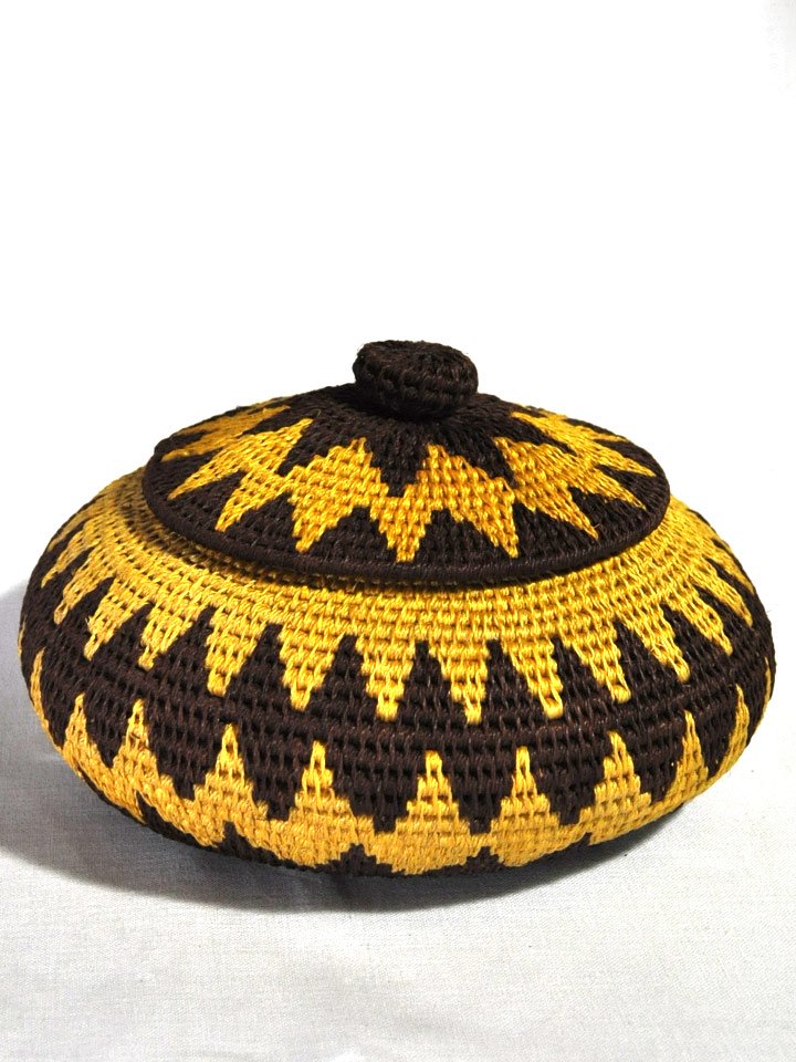 アフリカ(ジンバブエ)のサイザルバスケット/フタ付きポット型(壺)LL・イエロー×ブラウンウェーブ