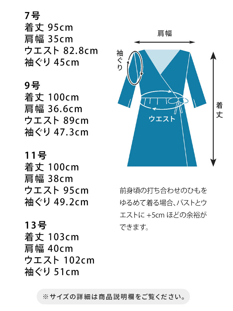 【9号】肩幅 36.6cm / バスト 96.6cm / ウエスト 89cm / ヒップ 142cm / 袖ぐり 47.3cm / 袖丈 40.5cm / 袖口 29cm / スリット 6.5cm / 着丈 100cm / ひも 47cm 4本