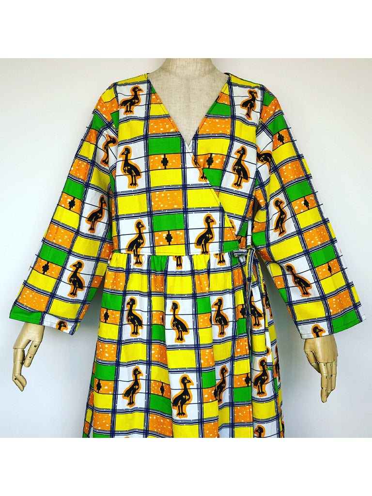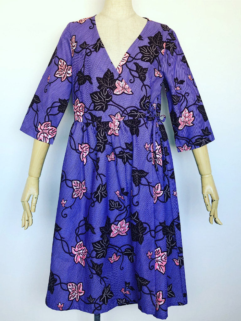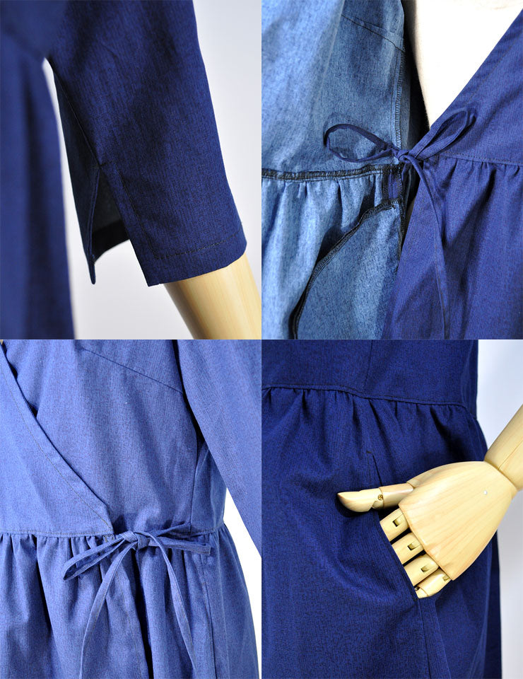 ポケット付きで七分袖、カシュクールのラップワンピースです。