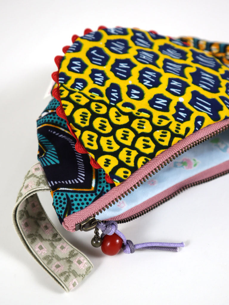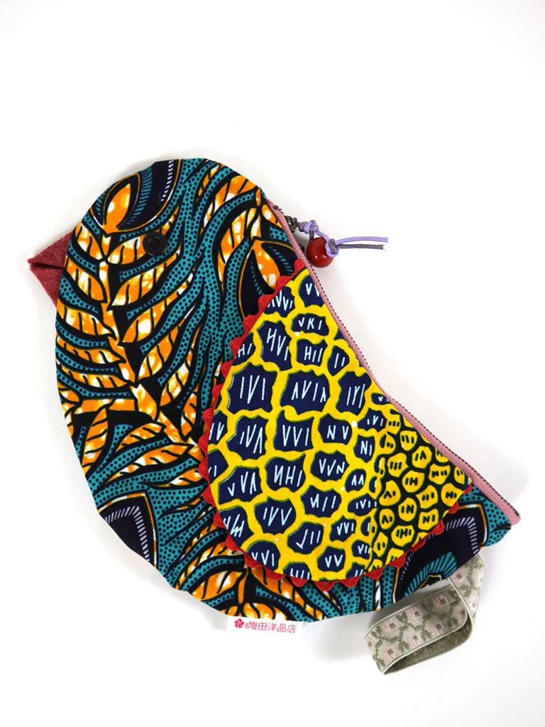 アフリカンプリントの鳥さんポーチ・オレンジ×ブルー×イエロー