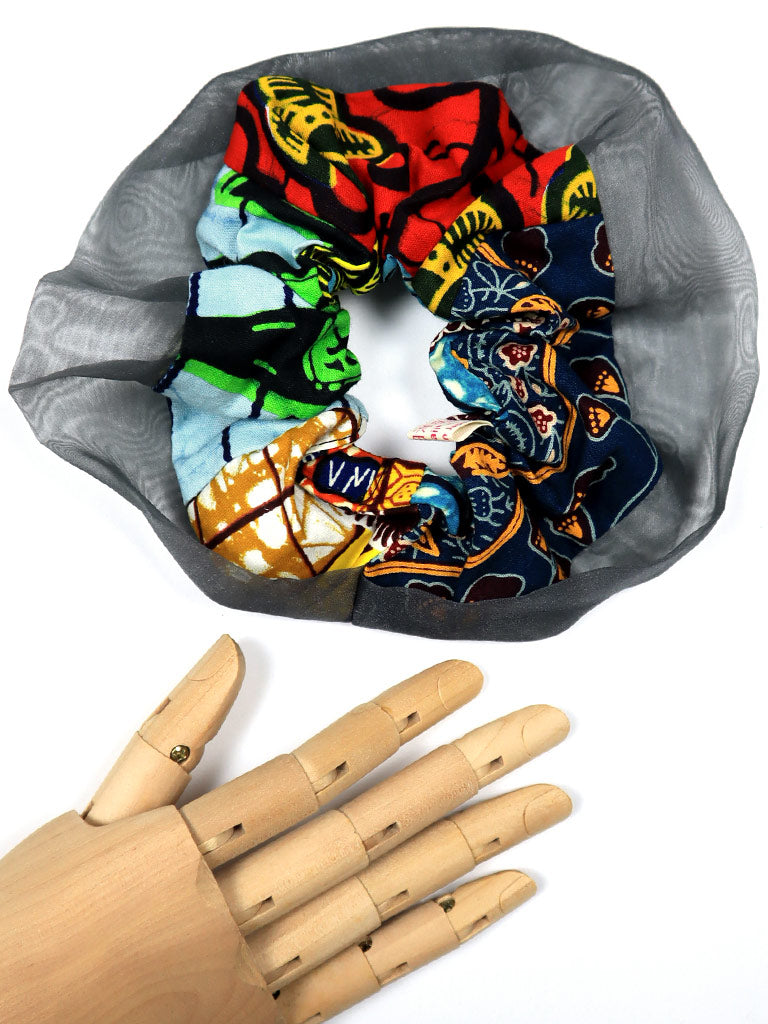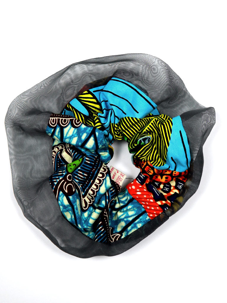 アフリカンプリントのパッチワークシュシュ・ブルー×ブラックのオーガンジー