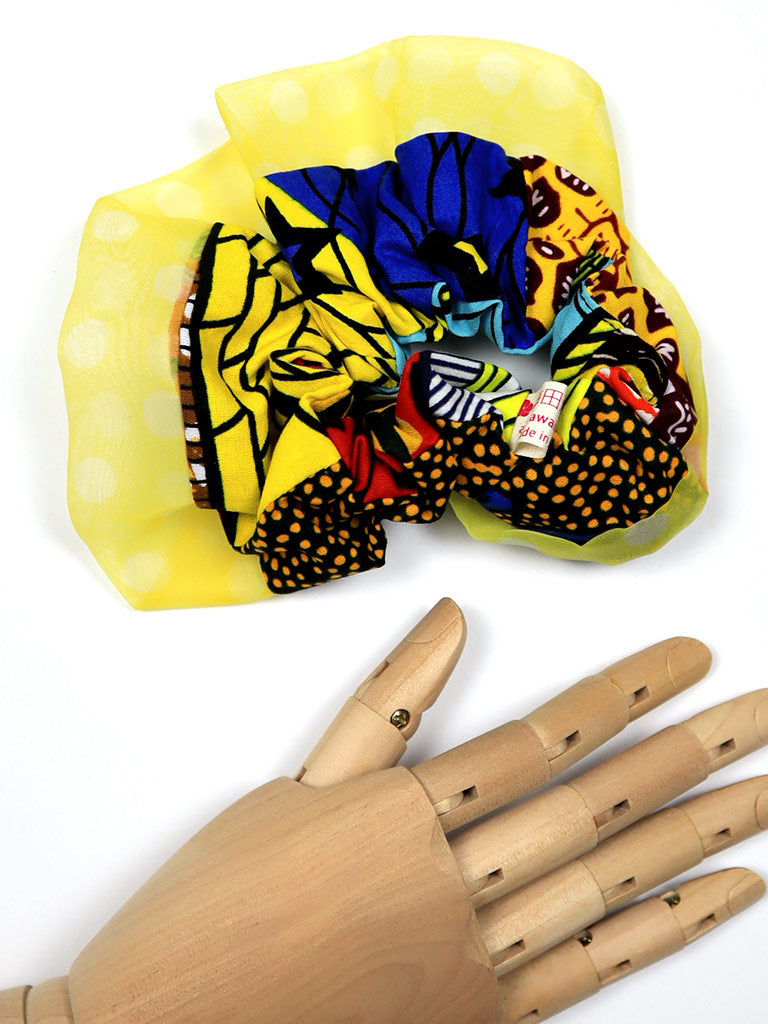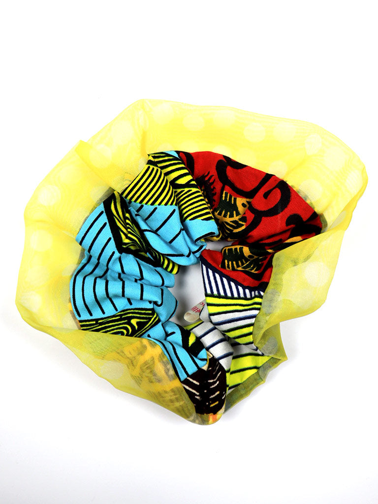 アフリカンプリントのパッチワークシュシュ・ブルー×イエローのオーガンジー