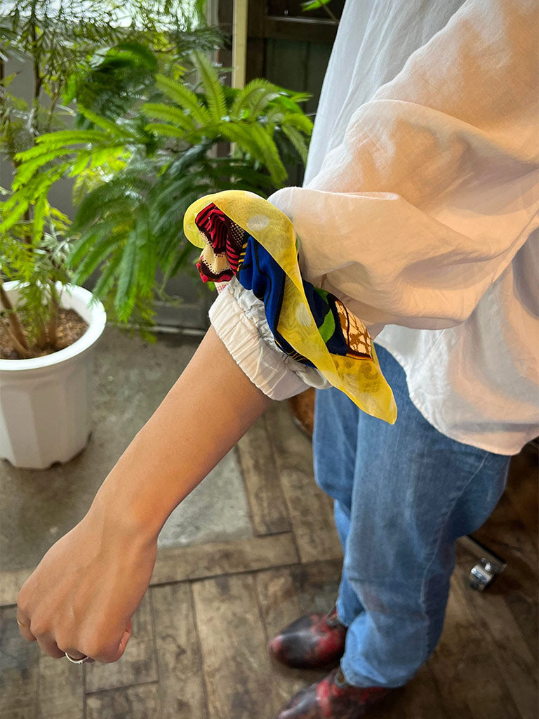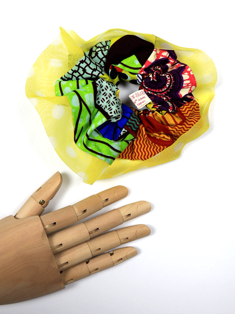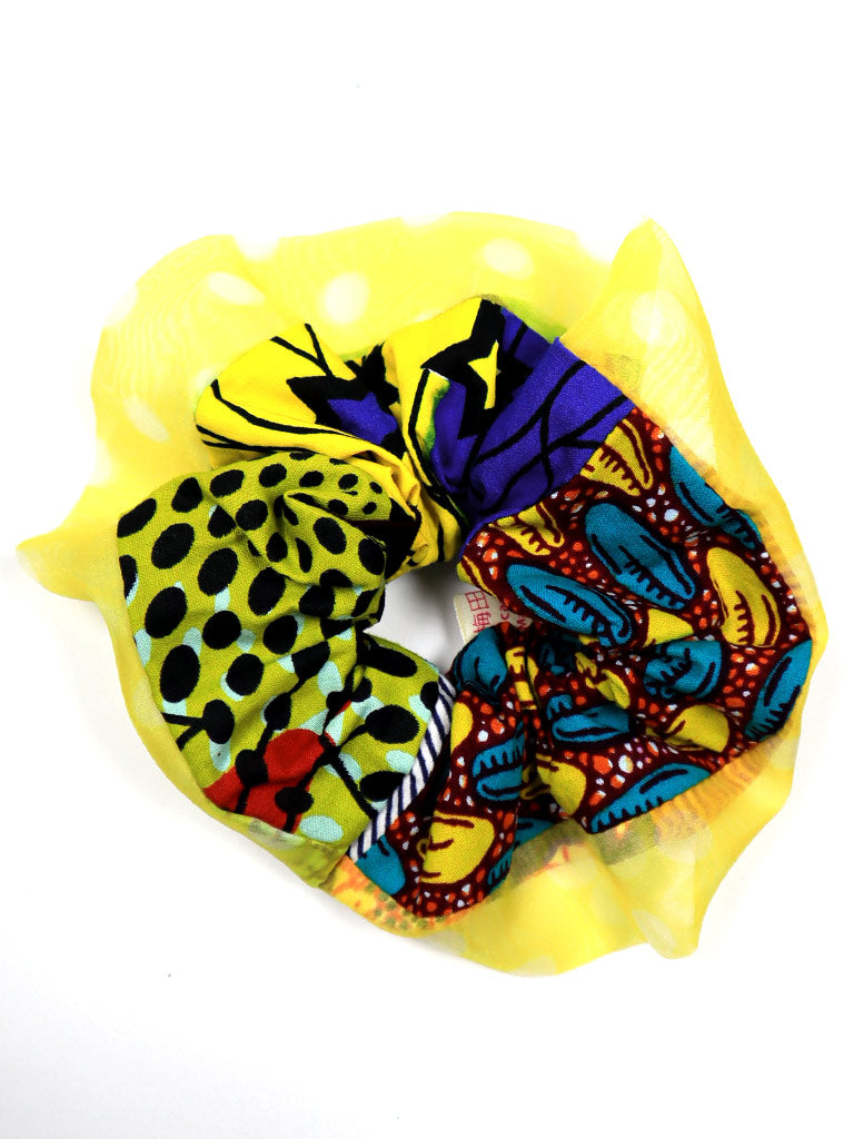 アフリカンプリントのパッチワークシュシュ・ブルーカカオ×イエローのオーガンジー