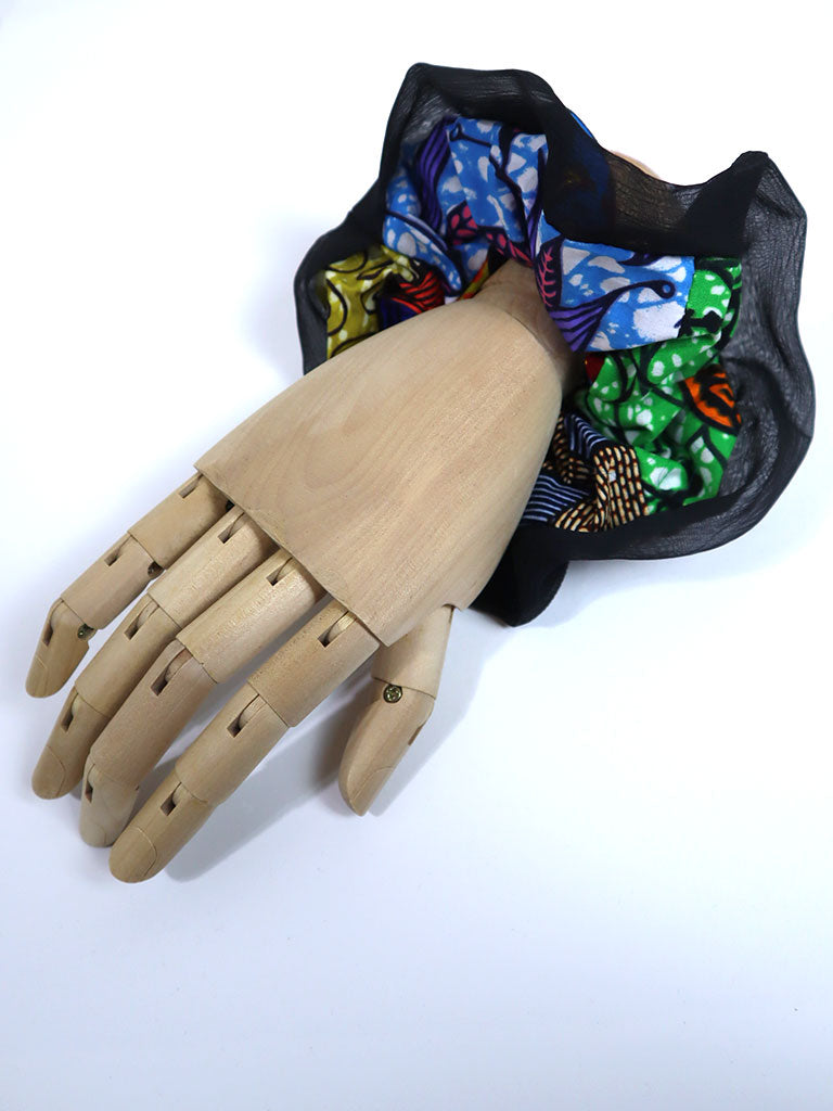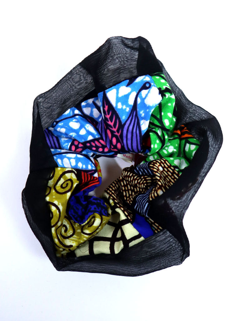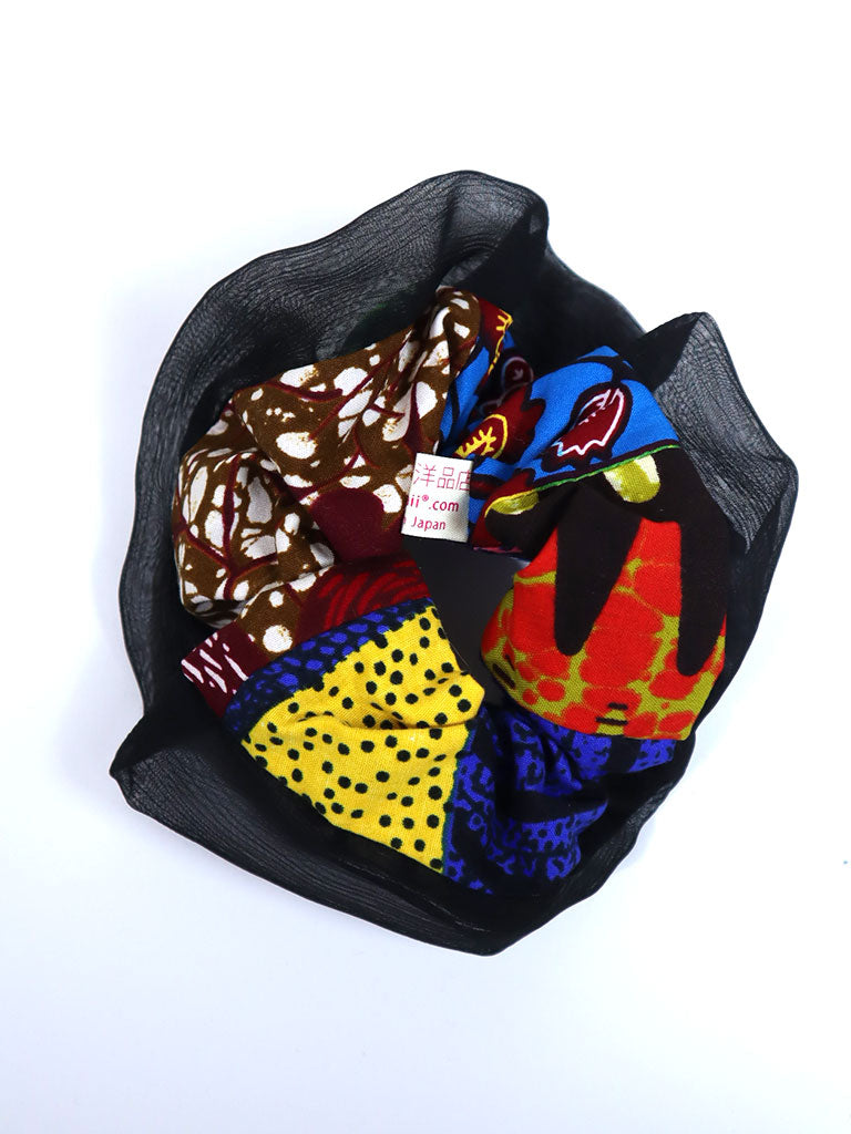 アフリカンプリントのパッチワークシュシュ・黒のオーガンジー