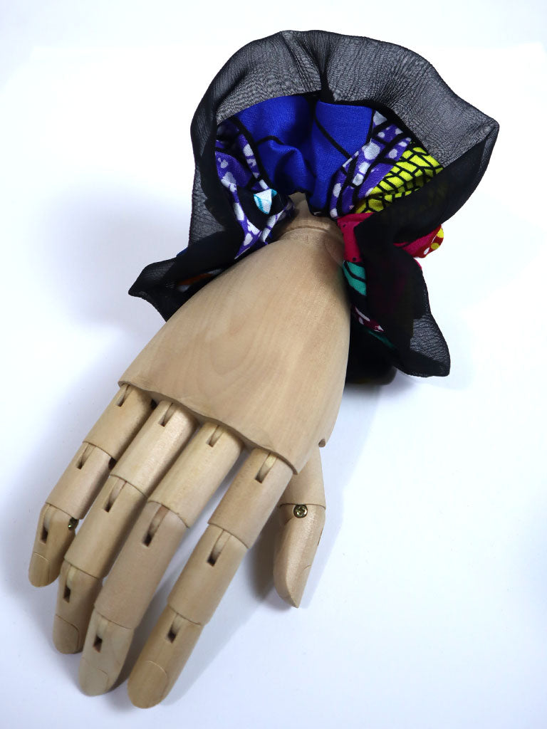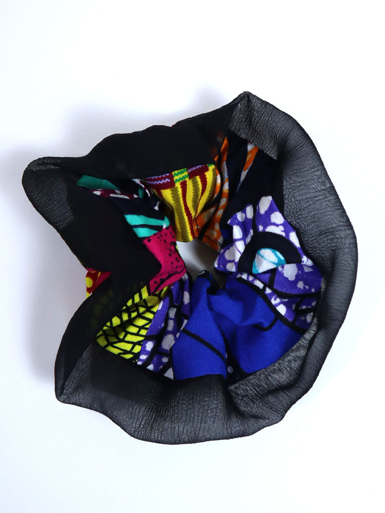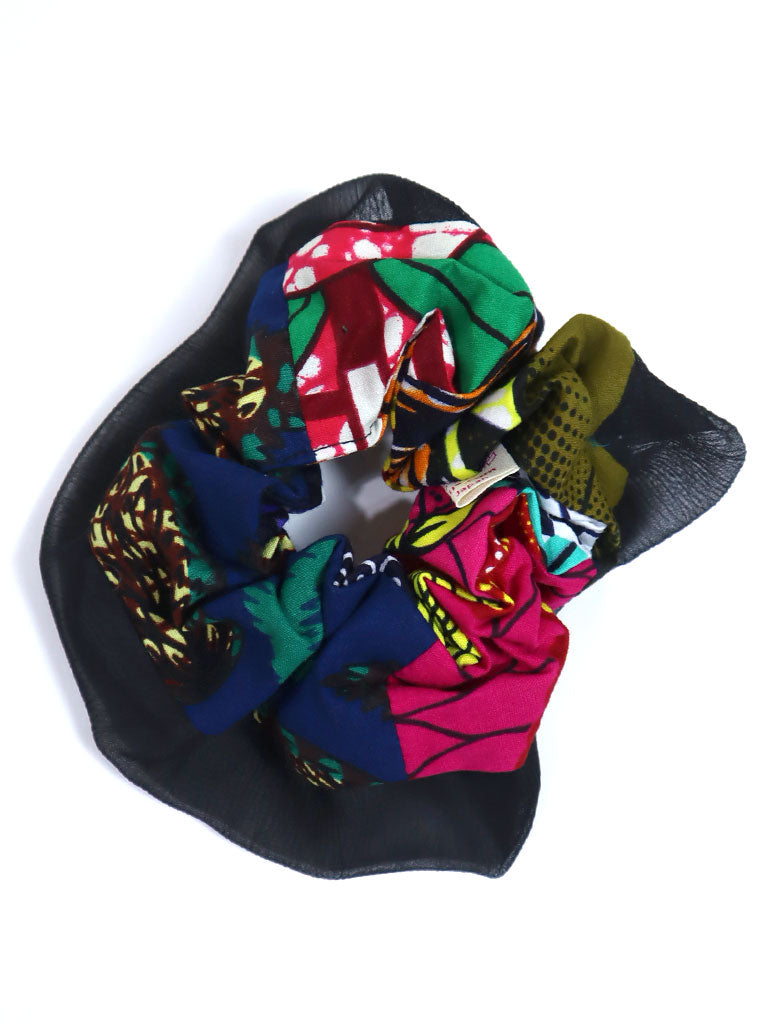 アフリカンプリントのパッチワークシュシュ・ブラックのオーガンジー