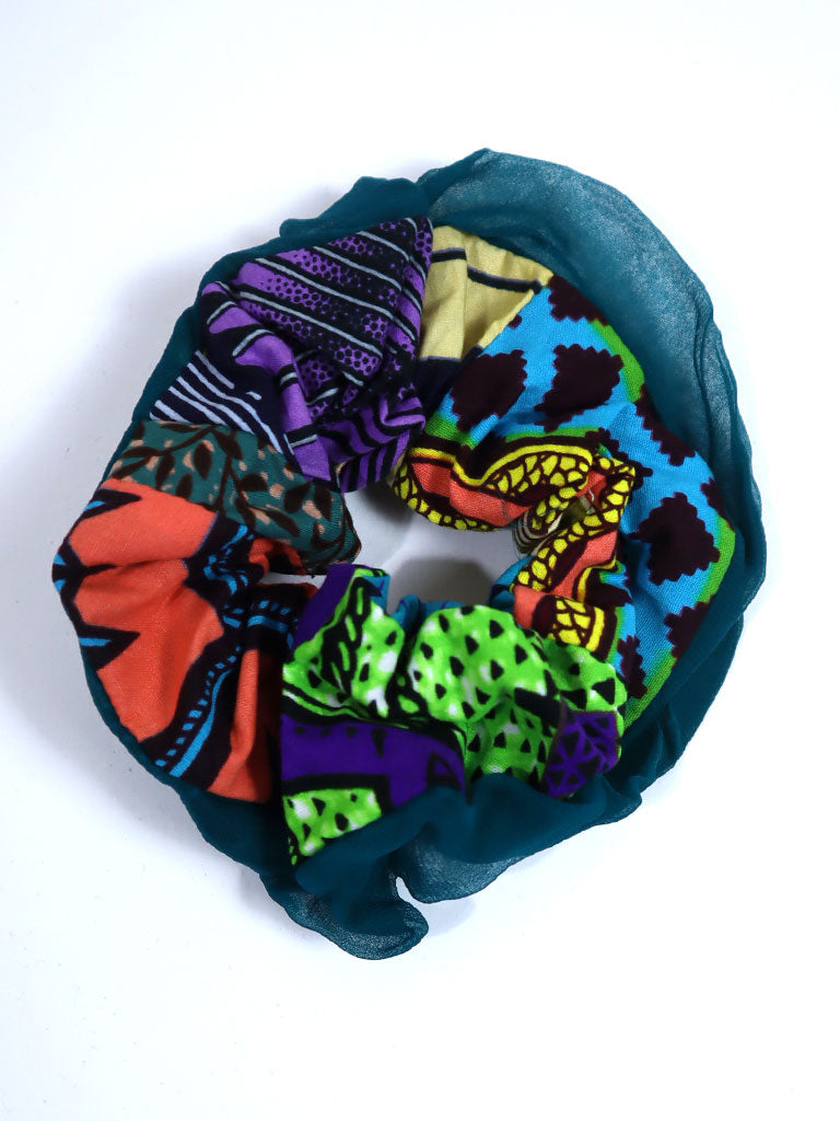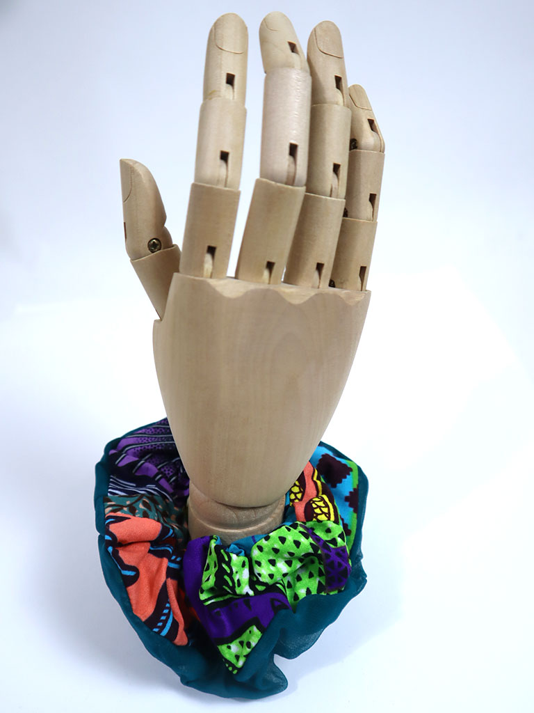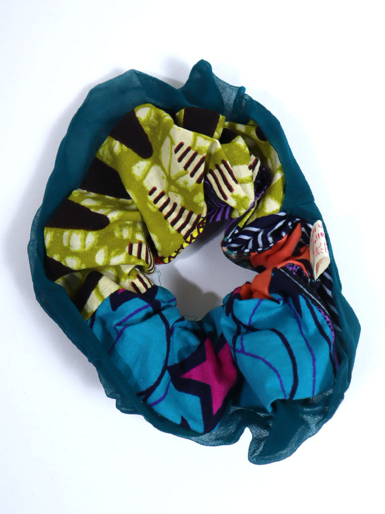 アフリカンプリントのパッチワークシュシュ・ターコイズのオーガンジーA