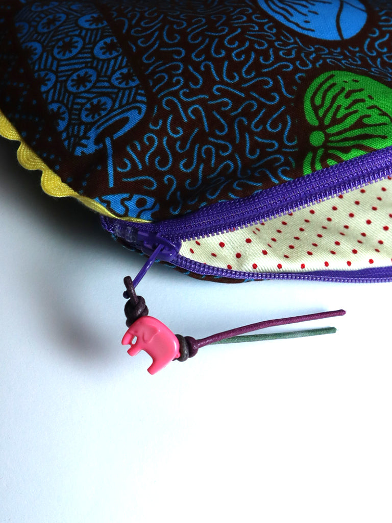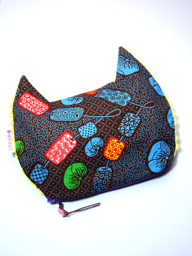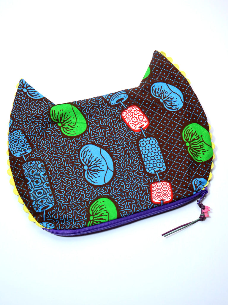 西アフリカのプリント布で作った猫の顔の形のポーチです。