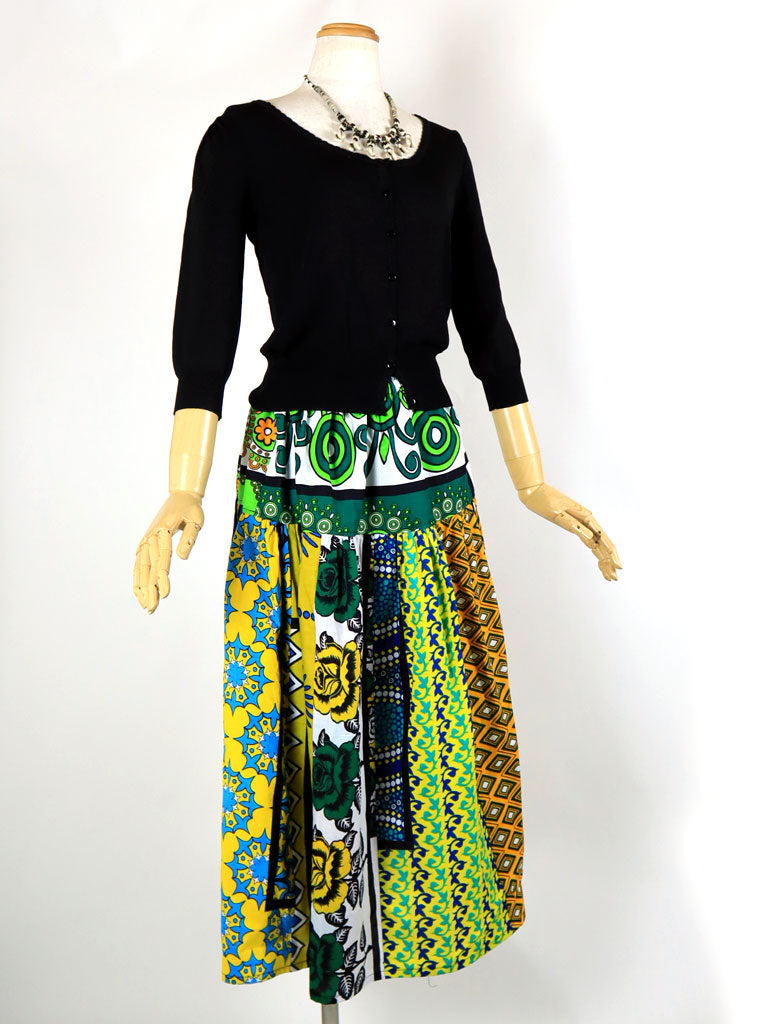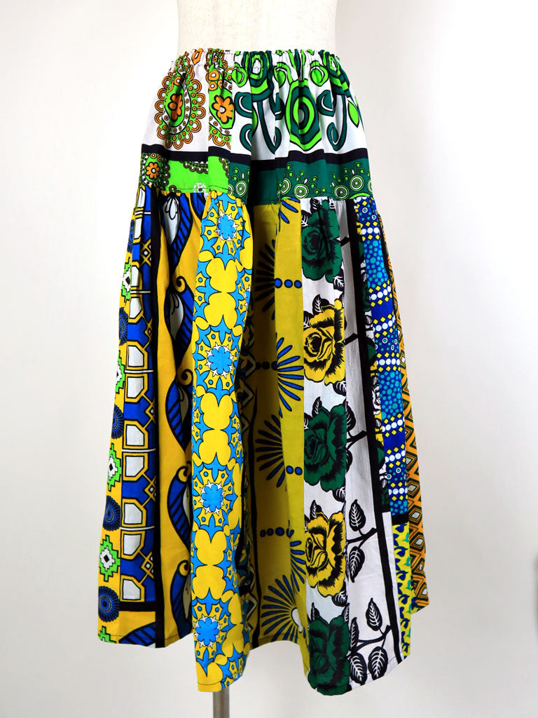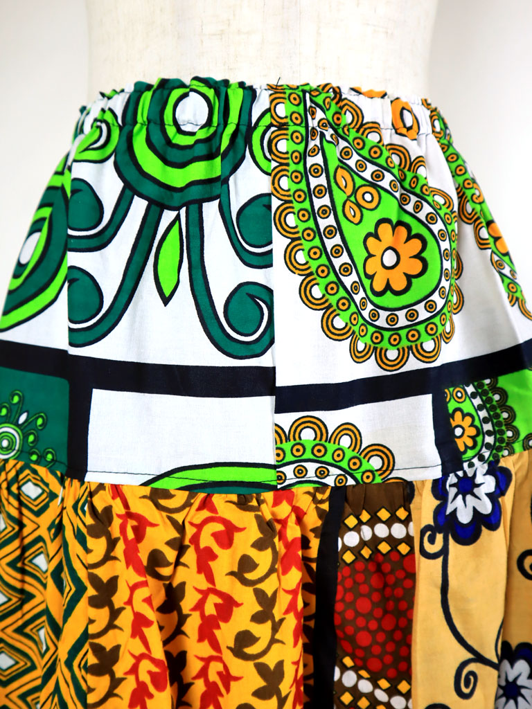 カンガのパッチワーク・ヨークロングスカート/グリーンペイズリー×イエロー