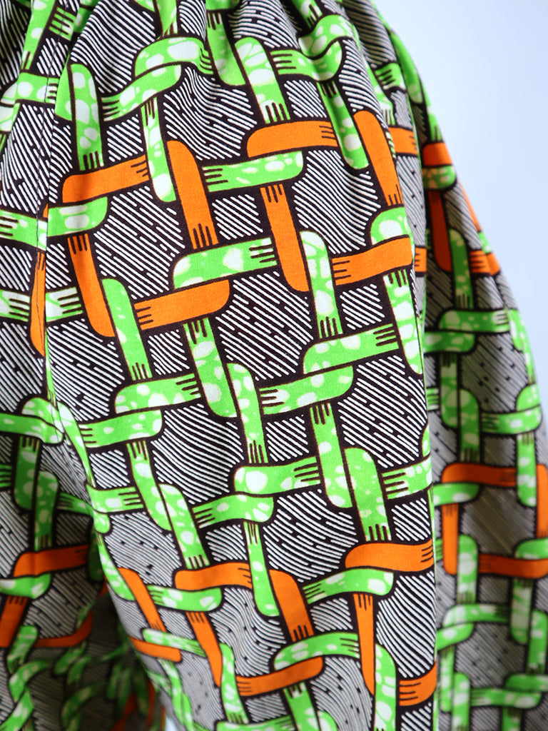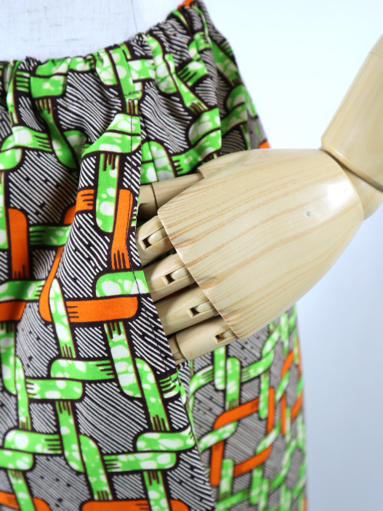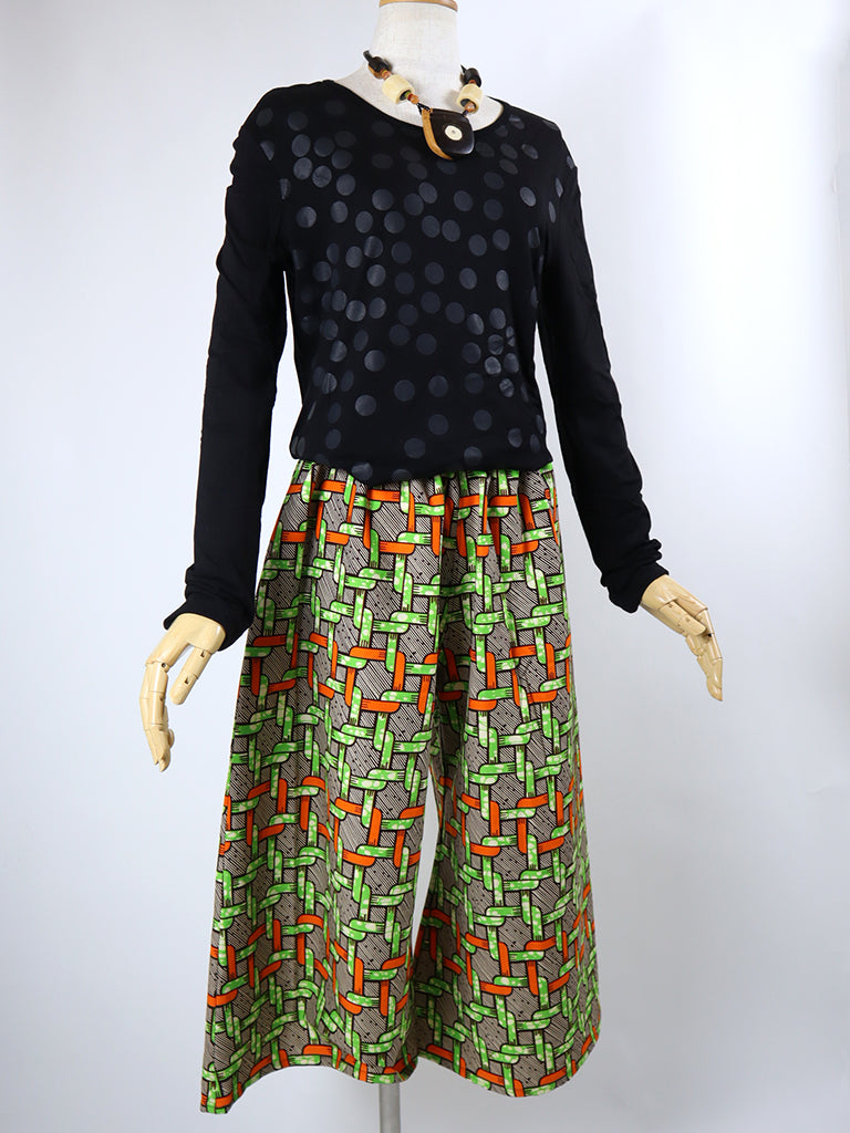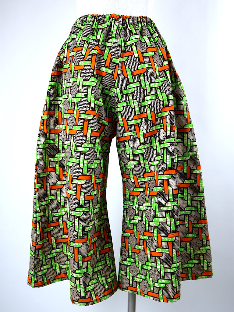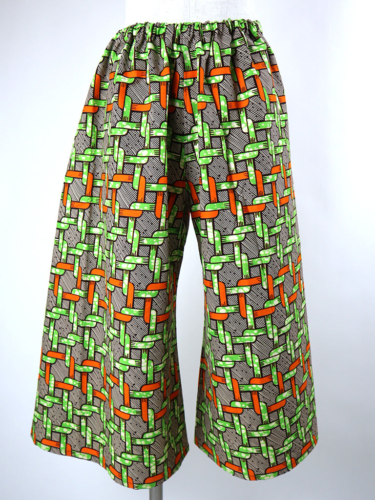 ゆったりとしていて動きやすい、アフリカンプリントでつくった「ガウチョパンツ」です。
