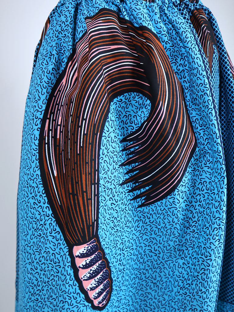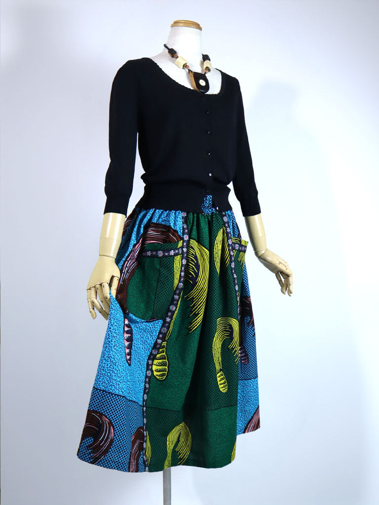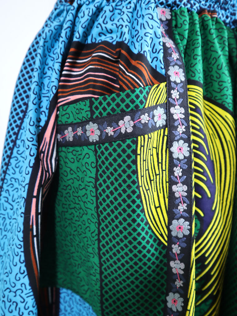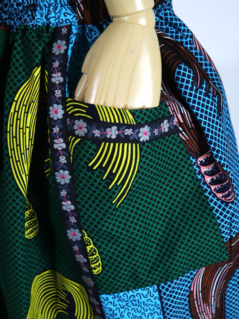 2種類のアフリカンプリントを使用し、中心布の切り替え部分とパッチポケットの口に刺繍テープをあしらいました。