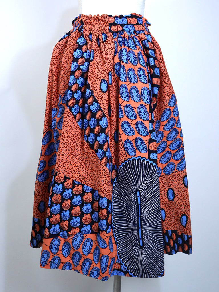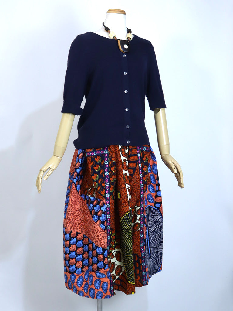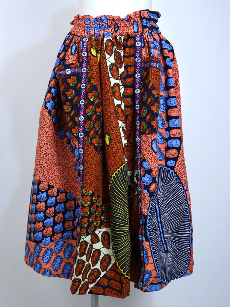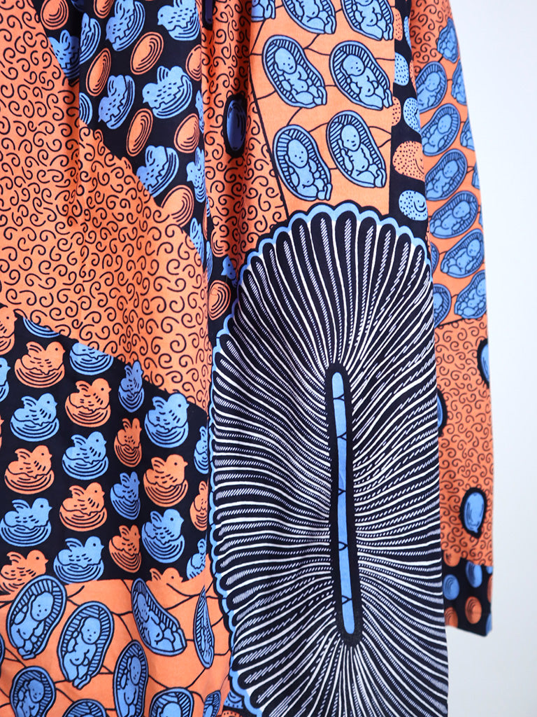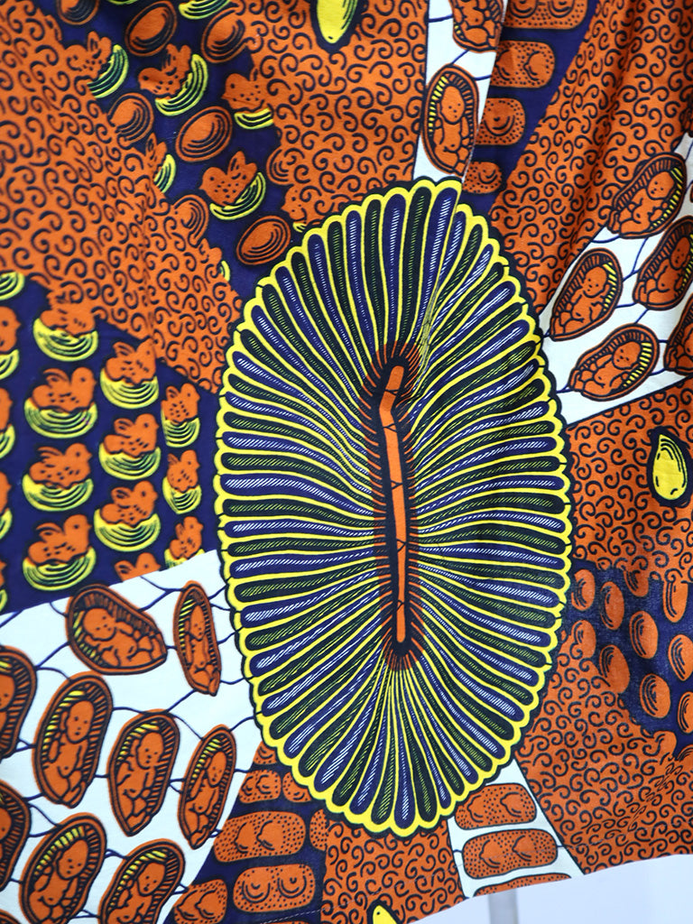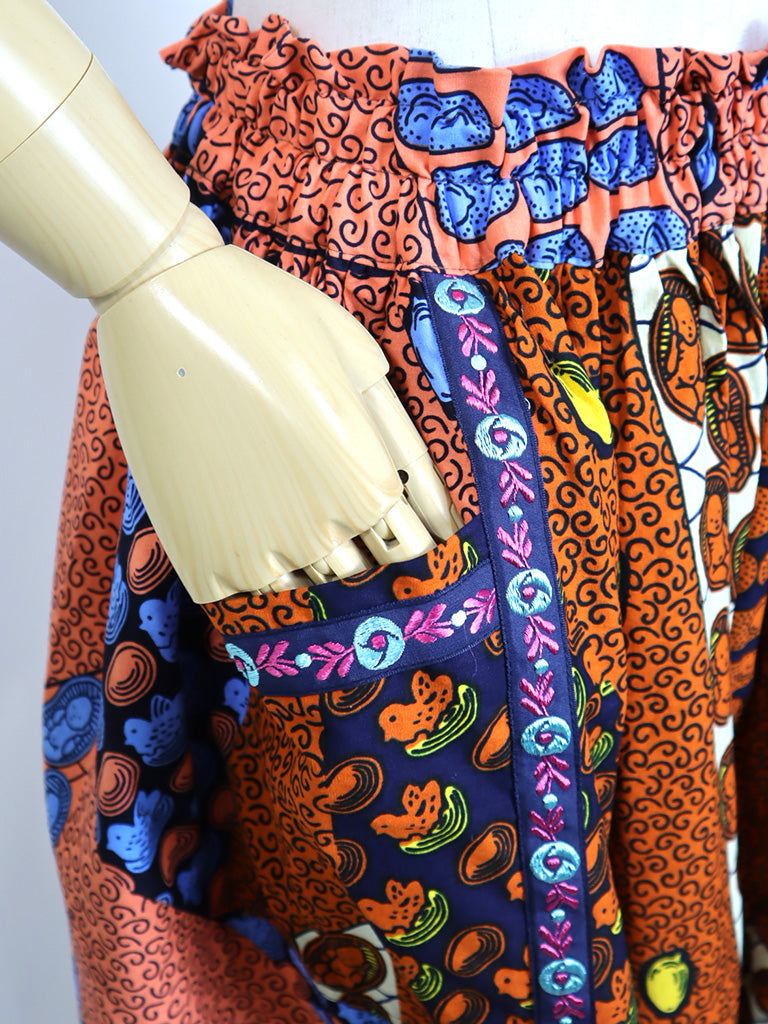 2種類のアフリカンプリントを使用し、中心布の切り替え部分とパッチポケットの口に刺繍テープをあしらいました。
