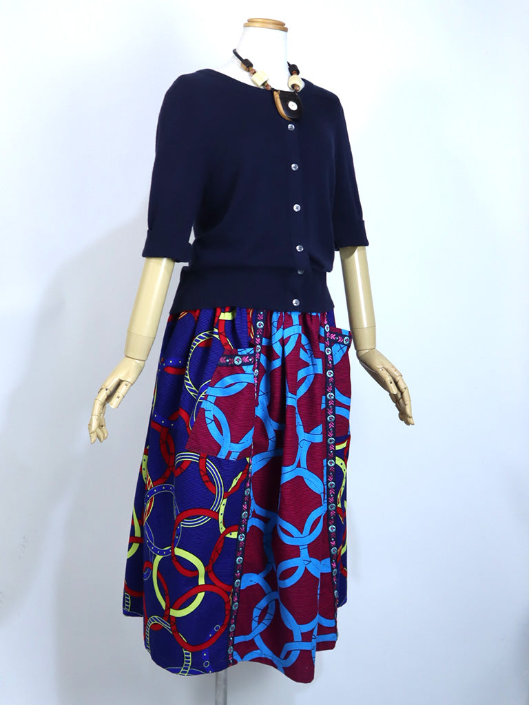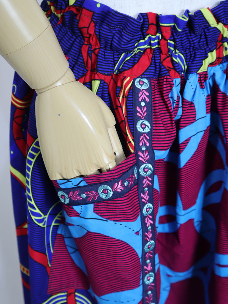 2種類のアフリカンプリントを使用し、中心布の切り替え部分とパッチポケットの口に刺繍テープをあしらいました。