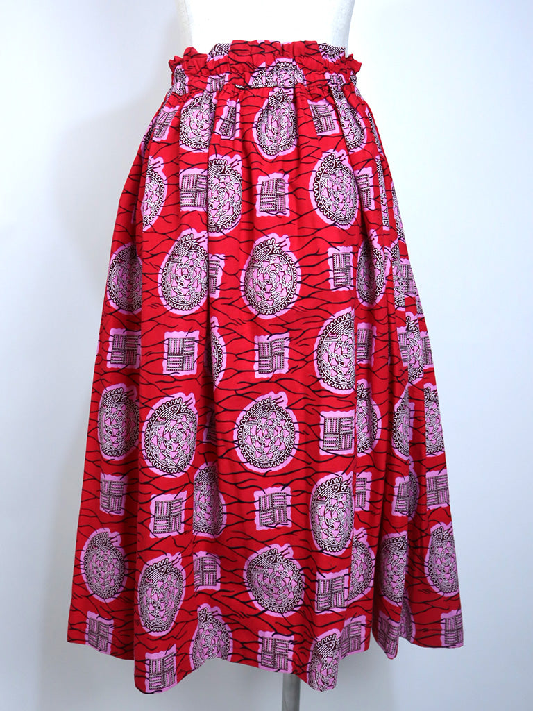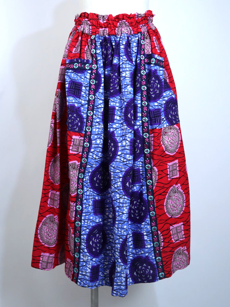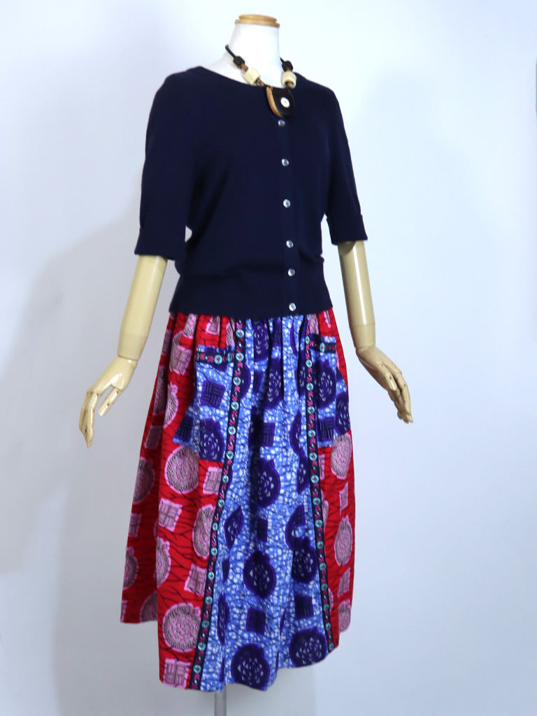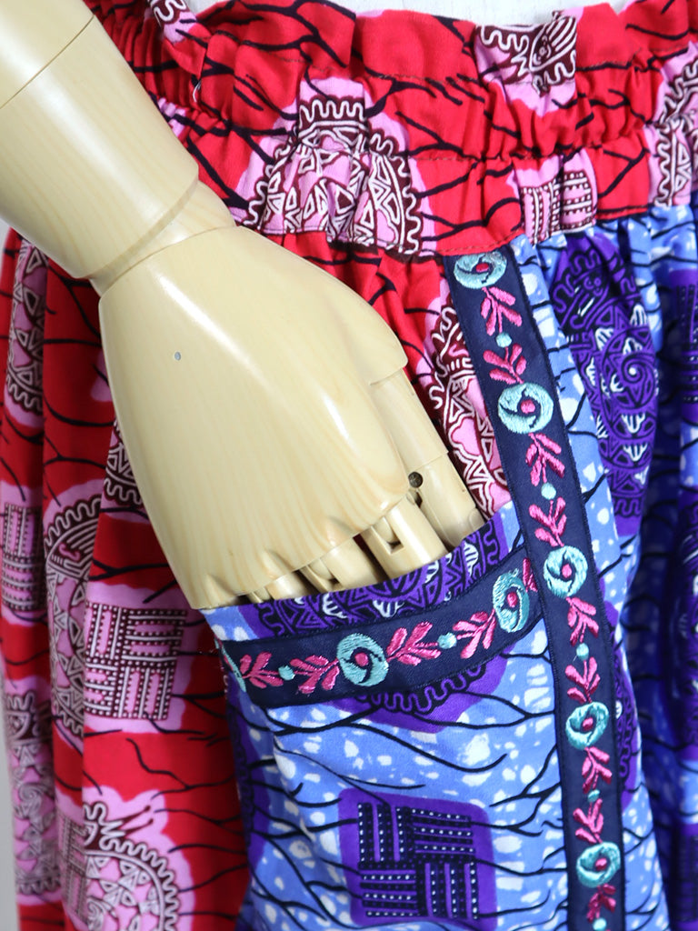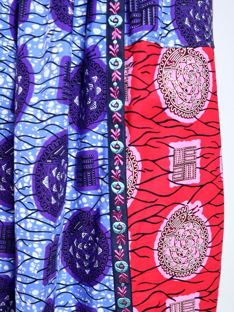 2種類のアフリカンプリントを使用し、中心布の切り替え部分とパッチポケットの口に刺繍テープをあしらいました。