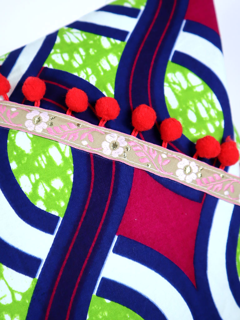 刺繍テープとぽんぽんをつけて華やかに仕立てました。