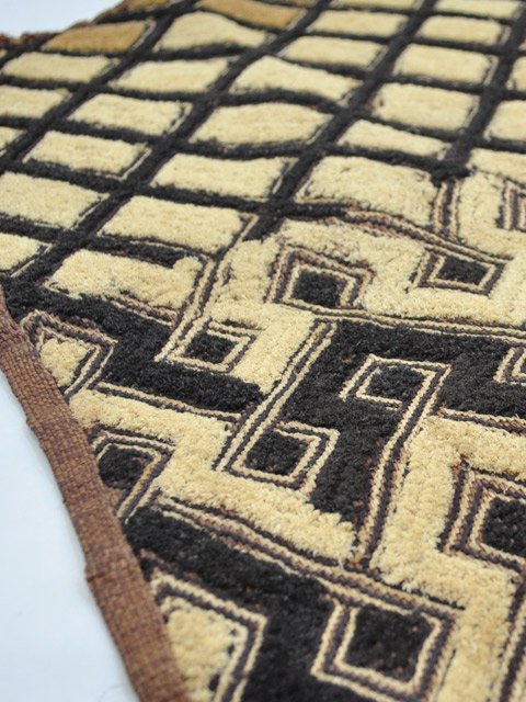 クバ人(コンゴ民主共和国)によってラフィアヤシで編まれた、いりくんだ幾何学模様がたいへん美しい布です。