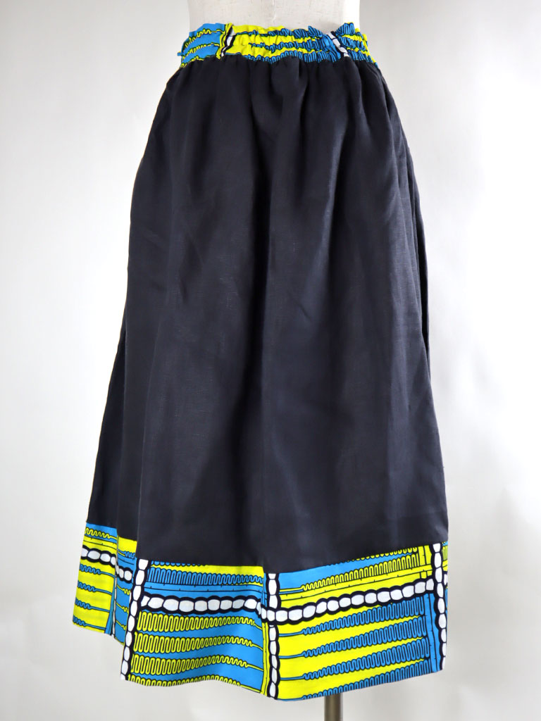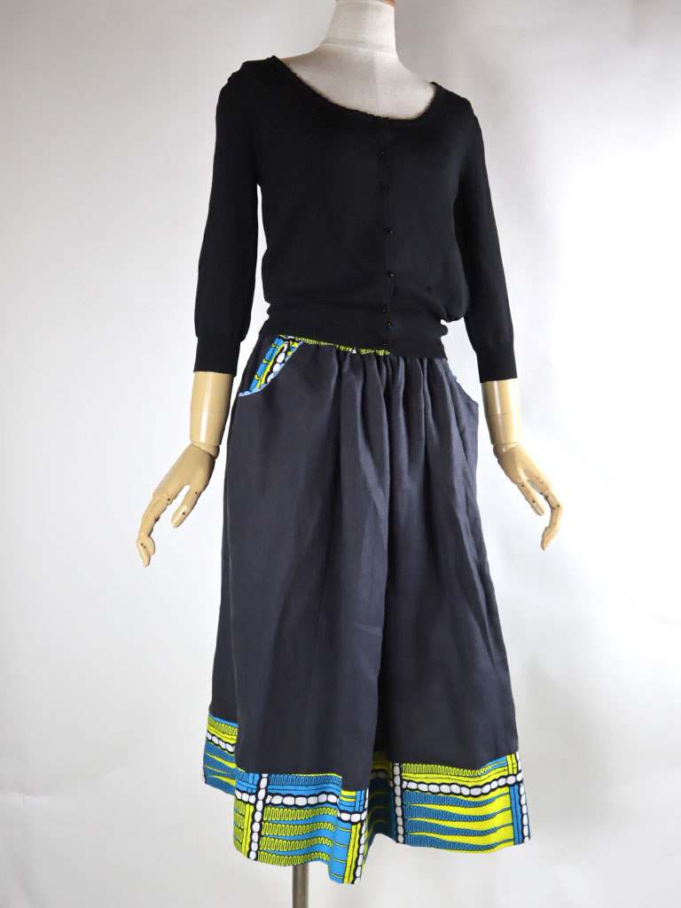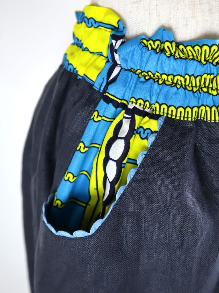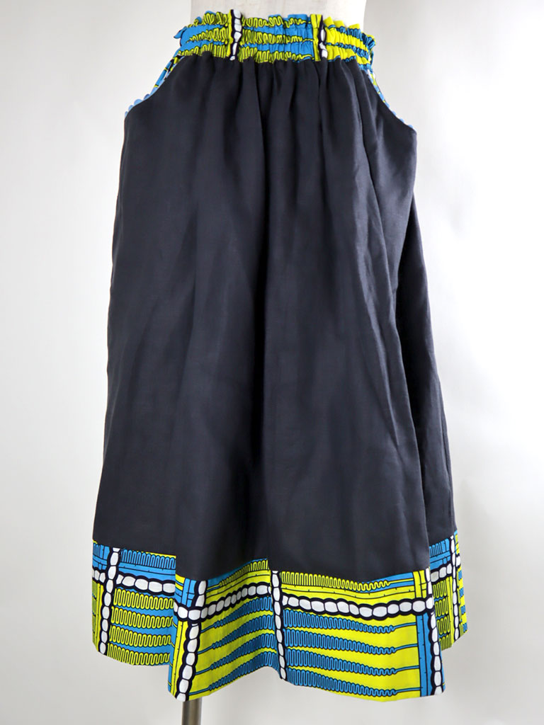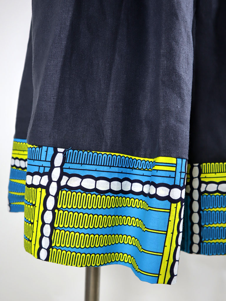 ウエストベルト、ポケット、裾の切り替えから下はアフリカンプリント。