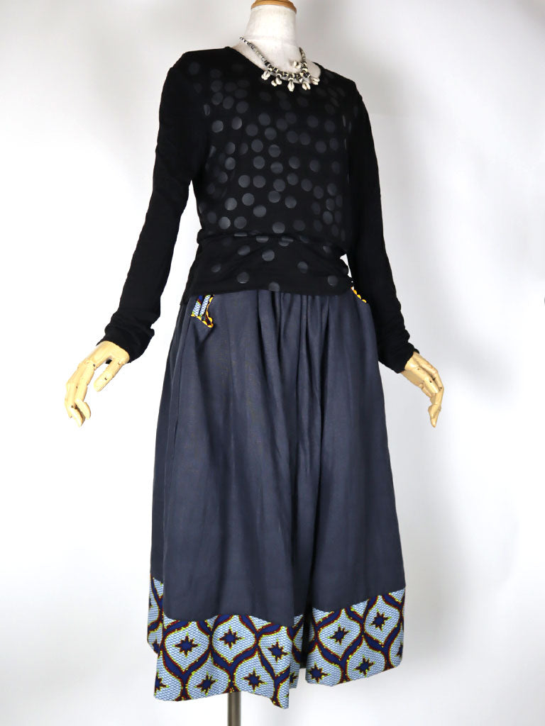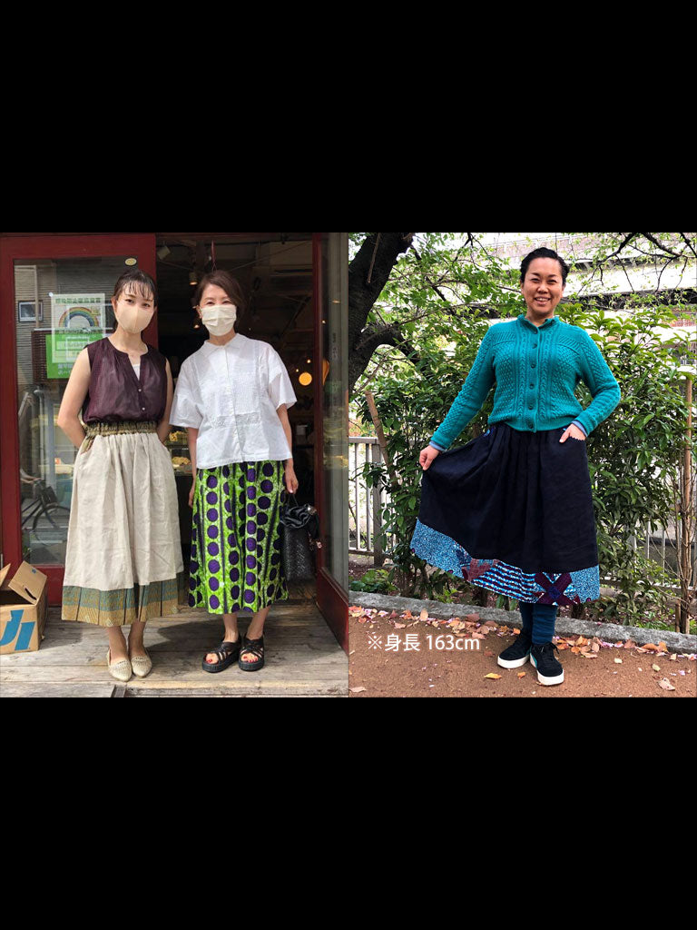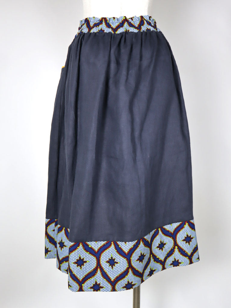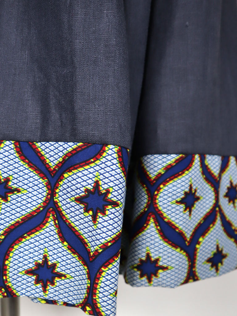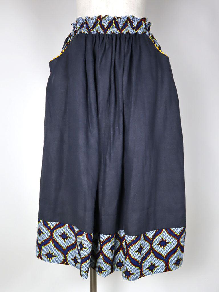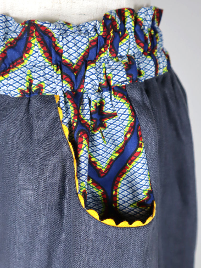 ウエストベルト、ポケット、裾の切り替えから下はアフリカンプリント。
