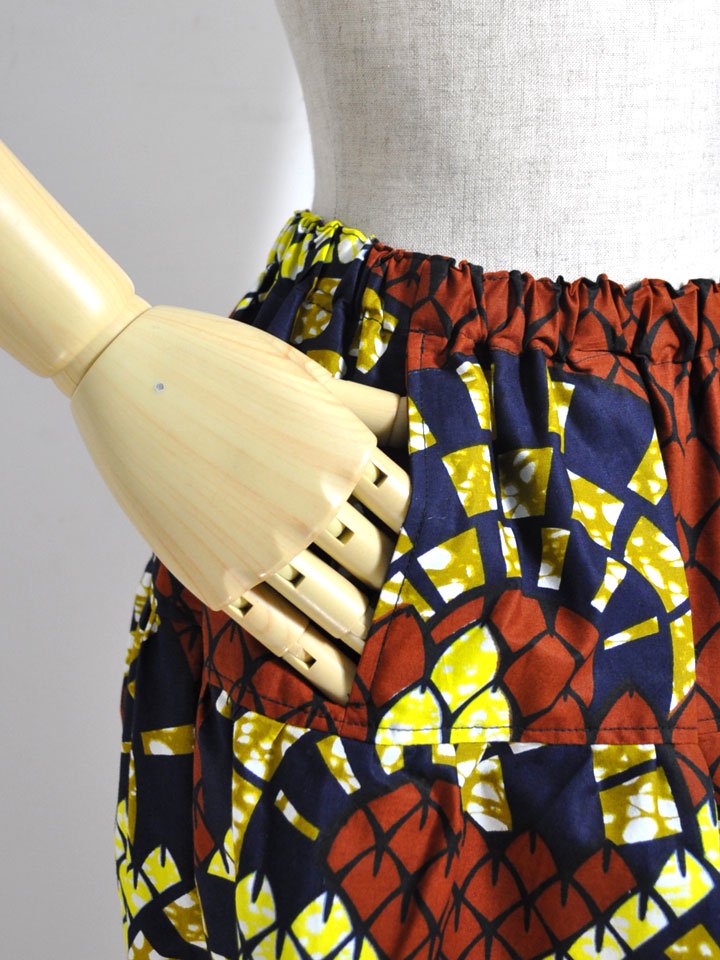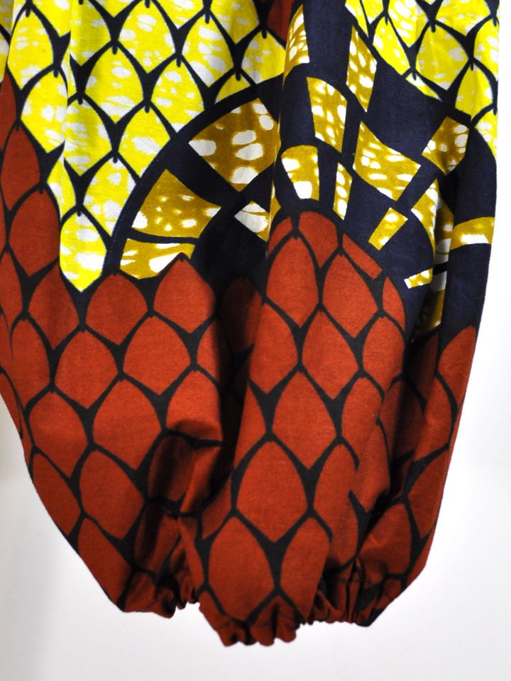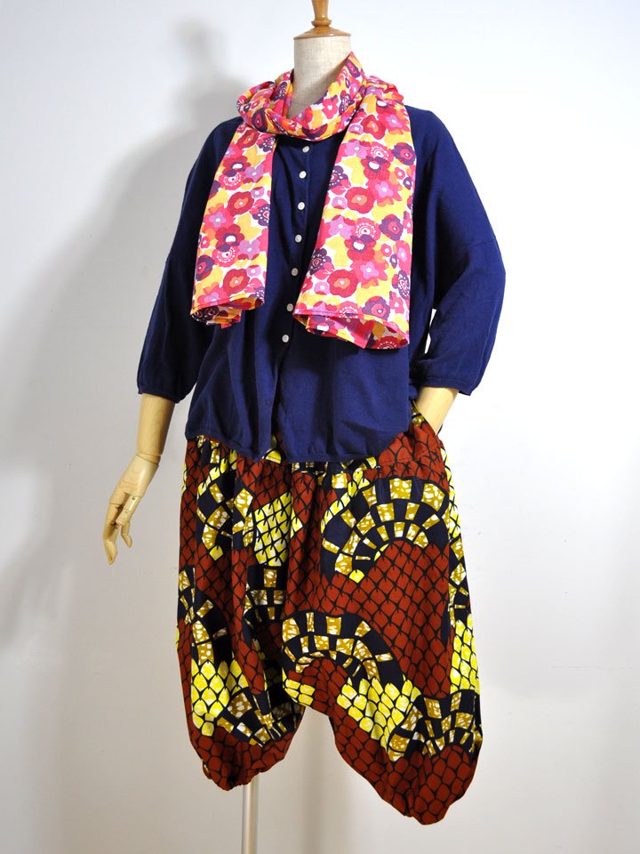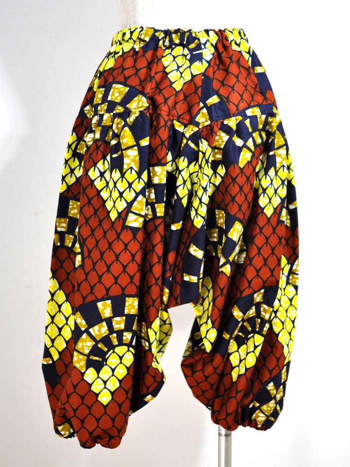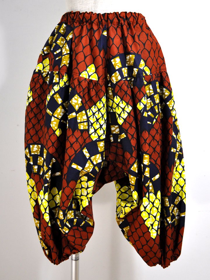 アフリカンプリントでつくった、ショート丈のサルエルパンツです。