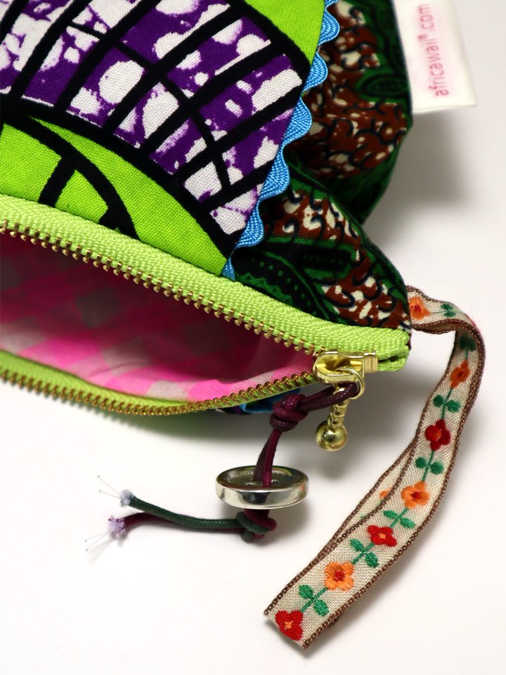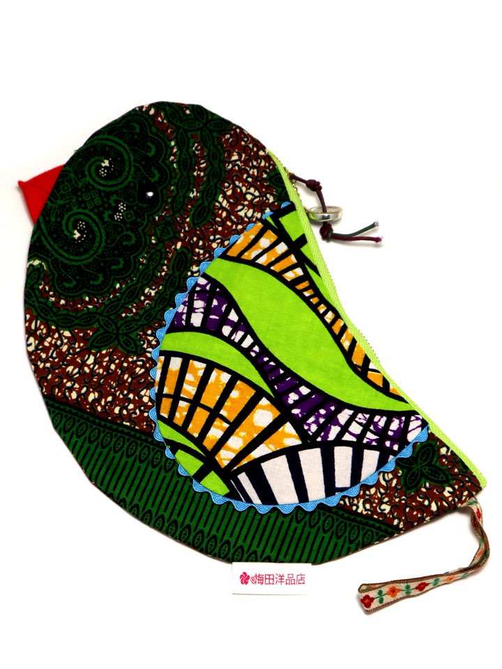 アフリカンプリントの鳥さんポーチ・グリーンボディ×レッドビーク
