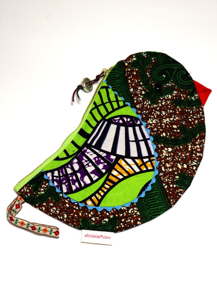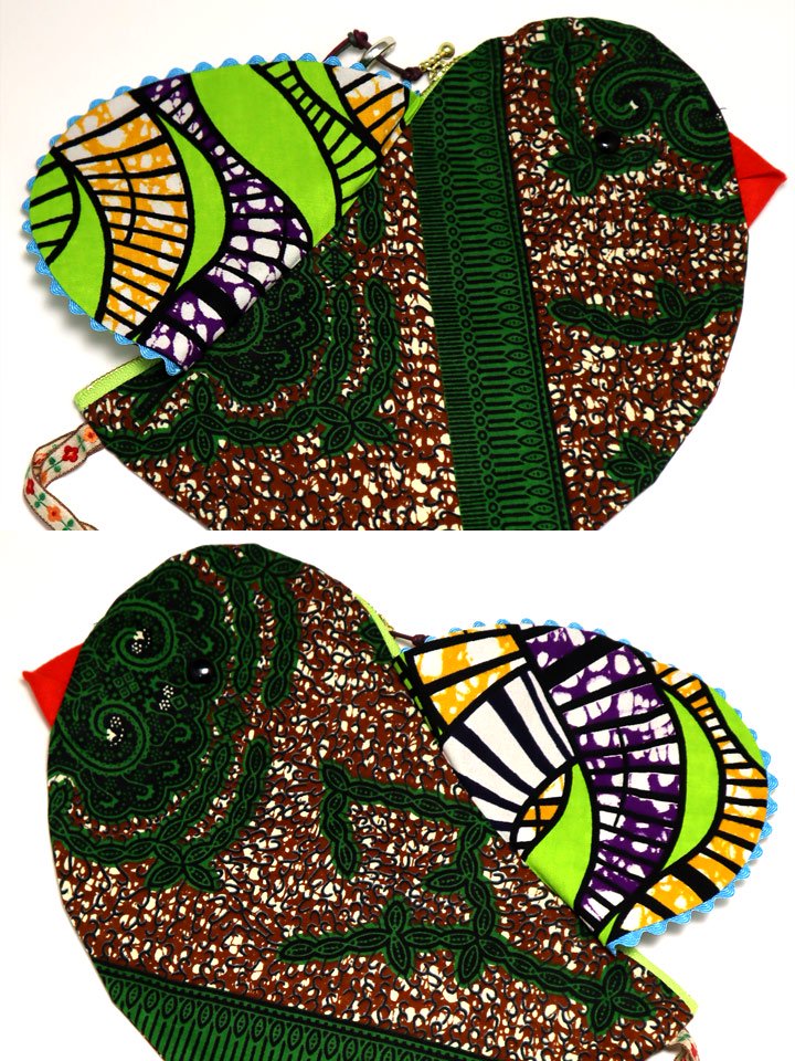 西アフリカのプリント布で作った鳥の形のポーチです。