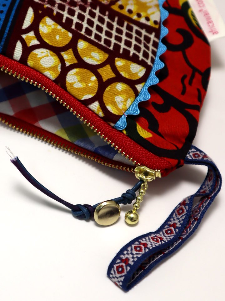 アフリカンプリントの鳥さんポーチ・レッドボディ×ブルービーク